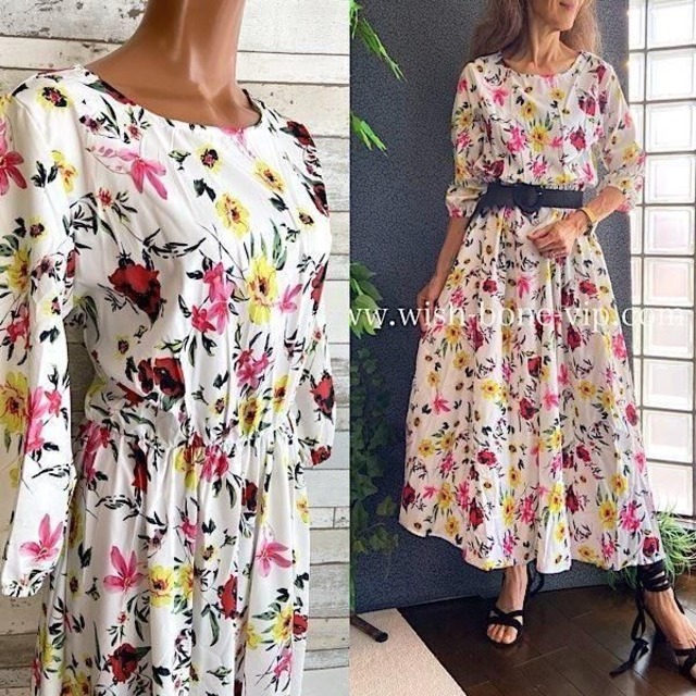 ガーリーなフラワーがロマンティックなロング・マキシワンピースです。ボトムのたっぷりな生地感も嬉しくなるシルエットです。腕を出したく無い派には嬉しい七分袖ですね。ベルトはお好みでマークしてくださいね。 *別売の伸びるフリーサイズのベルトは小物カテゴリーにございます サンダルでカジュアルに、パンプスでオンナっぽく!春夏のお出かけにぴったりなマキシドレスです。 (ハンガーかけでの採寸です。目安としてご参考にしてください。サイズが気になる方はご購入前にご質問してくださいね) ■平面サイズ■ バスト:50cm ウエスト:32~ゴムで45cmぐらい 丈:126cmぐらい ■着用サイズ■ マネキン (B80/W58/H83cm) / S モデル (B78/W60/H82/168cm) / S ■着用レポート■ バスト辺りはかなり余裕はありますが、ウエストでゴムが入っていて絞られているので、大きすぎる感じではないです。さらにベルトそしてみましたが、ベルトの色でも随分イメージが変わりますね。 ストレッチは少なめ ウエストはゴム ■カラー■ ホワイト&フラワー ■マテリアル■ Polyester ポリエステル 95% Spandex スパンデックス5%