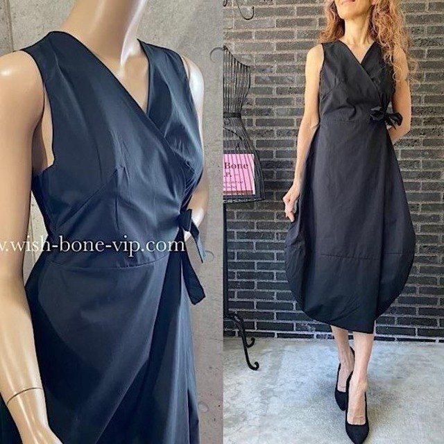 イタリア製インポートワンピース|Made in ITALY|コットン100%ラップ・バルーンワンピース|ミモレ・ロングワンピース/ブラック無地