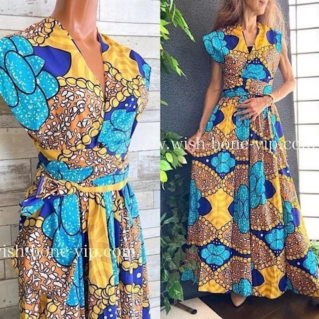 大胆なアフリカンカラーが目を引く ザ・インポート!な、マキシドレスです。着方はあなた次第!!! 夏のイベントや、衣装などにステキですよ~。 着方は届いてから、お好きなように生地を巻き付けて着てくださいね。 (上部の生地のくくり方でどうにでもなる感じのデザインですので、正確に採寸ができません。あくまで目安としてご参考にしてください。サイズが気になる方はご購入前にご質問してくださいね) ■平面サイズ■ USA表記Sフリー バスト:フリー ウエスト:37cmさらにゴム入り イメージ丈:150cmぐらい ■着用サイズ■ マネキン (B80/W58/H83cm) / フリー モデル (B78/W60/H82/169cm) / フリー ■着用レポート■ 大きめデザインですが、上部は生地を背中でクロスしたり、首にかけてホルターネックのように着たりと、アレンジが効くデザインです。まさにアフリカンなワンピース!衣装やイベントに最高!!なのではないでしょうか。色合いもビビットで間違いなく目を引きます。丈もたっぷりな長さです。ご参考までにモデル画像は中にキャミを着ていますので、その黒がチラ見えしています。 *イメージのマキシワンピース、ブログで紹介しています。ご参考にしてください】 https://wishbonevip.blogspot.com/2025/04/gw-italy.html ■カラー■ ブルー&イエローのアフリカンプリント ■マテリアル■ Polyester ポリエステル 100%