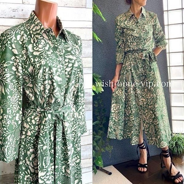 インポート長袖シャツワンピース|ロング・マキシワンピース|シックなグリーン系ワンピース