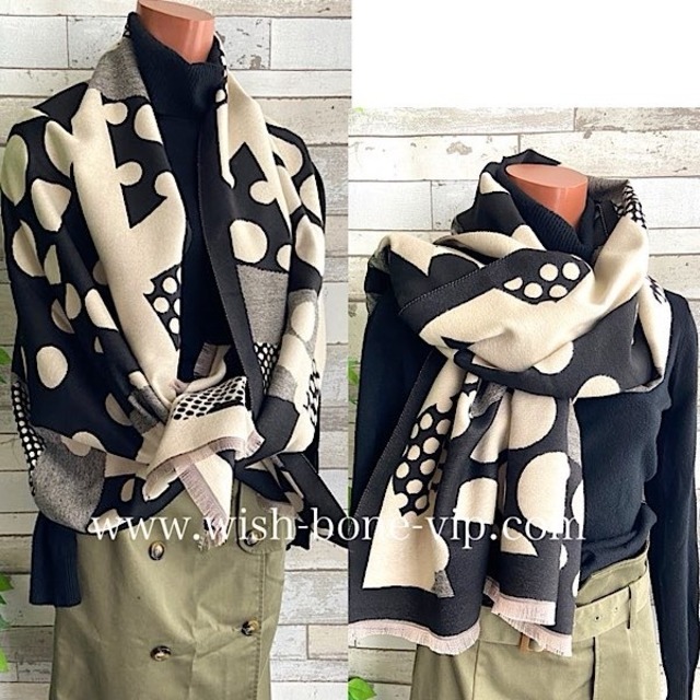 モノトーンのドット柄がモードな雰囲気にまとめてくれる羽織るだけでおしゃれでカッコいい厚手のストールです。リバーシブルで使えると思います しっかりめでキメの詰まった生地はカシミアっぽく、風を通さなさそうな素材で、肩から羽織れば暖かそうですよ。またワンピースやシャツに羽織ってベルトをすればジレ・ベストみたいなアウター変わりにもなりそうです。上品でステキなストールです。 【ブログでコーデアップしています。ご参考にしてください】 https://wishbonevip.blogspot.com/ 表記のサイズには多少の誤差があります。製作の過程などで小さな織り傷やプリントの色むら、小さなシミのようなかすれ小さな色むらや織りむら、生地のネップによる細かいキズなどはあるものもございますが不良品ではございません。独特の染めやプリントなどインポートの風合いをお楽しみいただけたらと思います。全て丁寧に検品しております。 ■サイズ■ 約180x66cmぐらい ■素材■ ポリエステル 100%(表示タグ無し) (素材イメージ:生地のキメが詰まったテカリの無いマットな質感) ■カラー■ *モノトーンのドット系アートなプリント