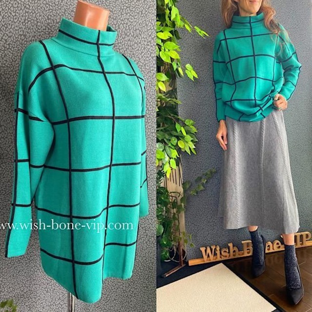 イタリア製 厚手プルオーバー Made in ITALY|ボトルネック・チュニック・厚地&長めのトップス/格子ブラック&グリーン