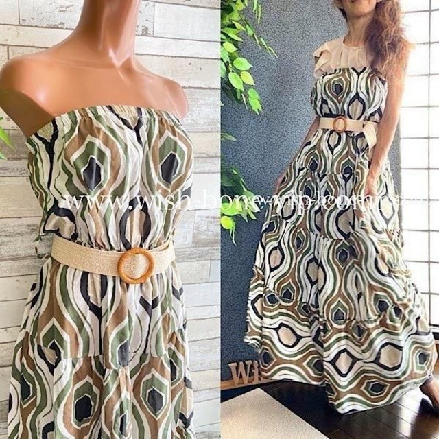 イタリア製インポート マキシドレス・ロングワンピース|Made in ITALY| コットン100% ベアトップワンピース(ベルト付き)/グリーン(Free)