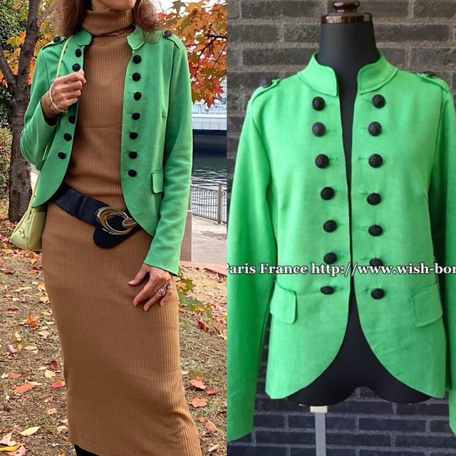 【フランス直輸入】大人のカジュアルなコーデにおすすめなアイテムです。 とても珍しい質感のかる~いジャケットです。 フロントのボタンとスタンドカラーのミリタリーデザインが、ほんとに渋くてカッコいいですよ。羽織ればパッとインポートのコーデに仕上がる不思議なジャケットです。 パリの買い付けで一目惚れでした。 デニムにもワンピースにもあうので、着まわせそうですね。 羽織る感じのデザインですので、ゆったりです。腕をまくって着てもオシャレですよ。 (ハンガーかけでの採寸です。伸縮性ですので若干異なります。目安としてご参考にしてください。サイズが気になる方はご購入前にご質問してくださいね) ■平面サイズ■ *フランス/S完売 *フランス/M完売 *フランス/Lのみ 肩幅:約44cm バスト:約50cmぐらい(脇のあたりのおおよそ) すそ:約54cm そで:約63cm(折らずに伸ばした長さ) 丈:(えり含まず後ろ側)約67cm ■マテリアル■ ポリエステル 98% スパンデックス 2% *ストレッチ:有り *裏地:無し *ポケット:ダミー *品質タグ表記:念のため色移りなどにはご注意ください *きりっぱなしデザイン ■カラー■ *グリーン ■マネキンサイズ■ 黒ボディ/B80/W60/H85cm(S着用) 白ボディ/B88/W66/H89cm(L着用) モデル/169cm.B78.W60.H82(S着用) フランス,パリのメーカーさんにて直接オーダー&買い付けし、丁寧に保管しています。最新のデザインをお楽しみくださいませ。 フランスインポート デザイン/フランスパリ Brand:tag/Paris made in China 品質タグ:英