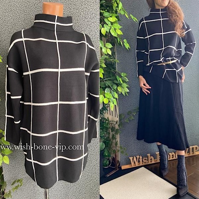 イタリア製 厚手プルオーバー Made in ITALY|ボトルネック・チュニック・厚地&長めトップス/格子チェック・ブラック