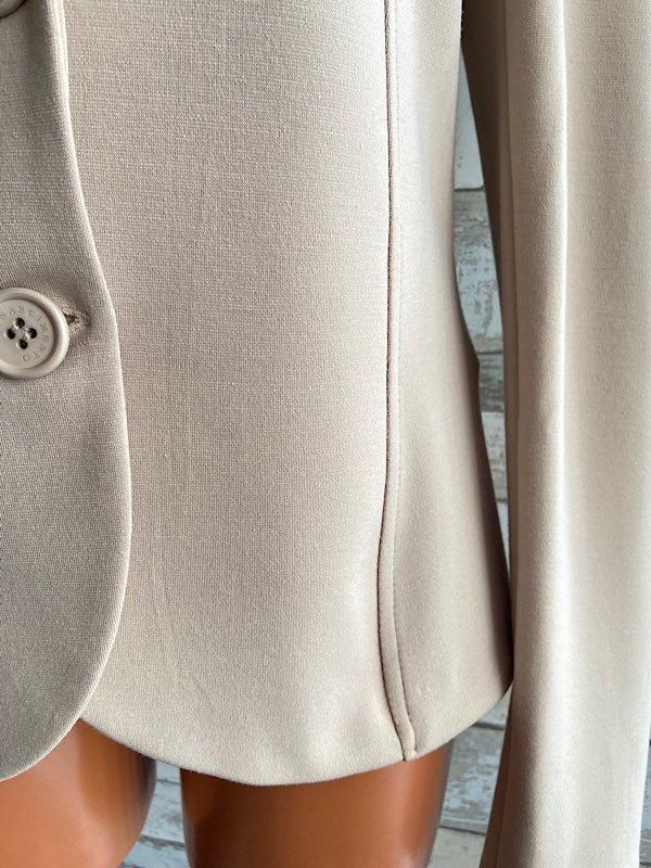 2つボタンは、気持ち丈も長めですので、パンツスタイルにもよく合い、また小さめのエリは胸元もキレイに見せてくれるので、ジャケットですが、ガチガチなお仕事オフィスっぽく見えないのも良いです。