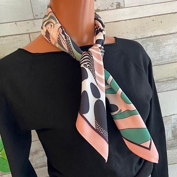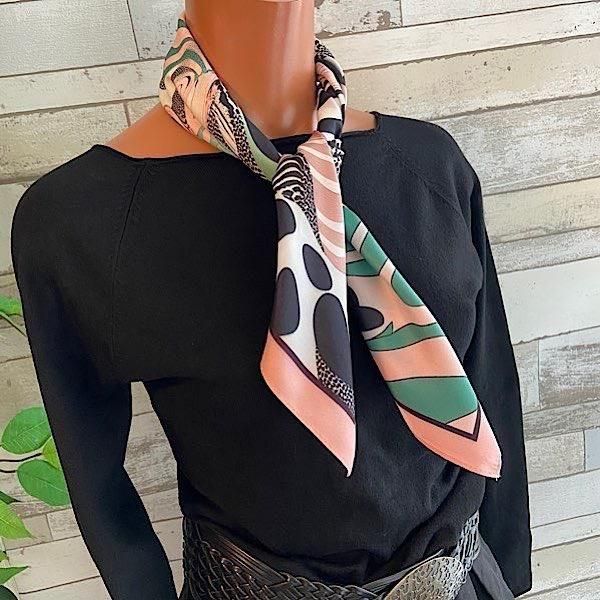 こちらマットな質感がテカテカせずキレイめにピッタリなアクセ感覚なおすすめなスカーフですよ。首元の紫外線対策や、ちょっと殺風景になりがちな時にくるっと巻いてくくるだけです。また飽きたら、バッグに巻いてもオシャレです。 この大きさならレストランやバーなどお食事の時に巻いててもキレイです。