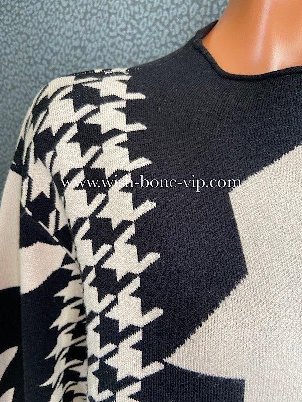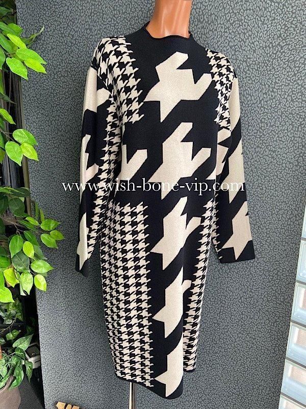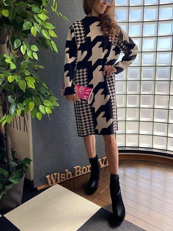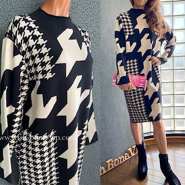 *Made in ITALY/イタリア製ワンピース|モードなきれいめカジュアル 千鳥格子 厚手冬物ニット モノトーン / ブラック&クリーム(Free)