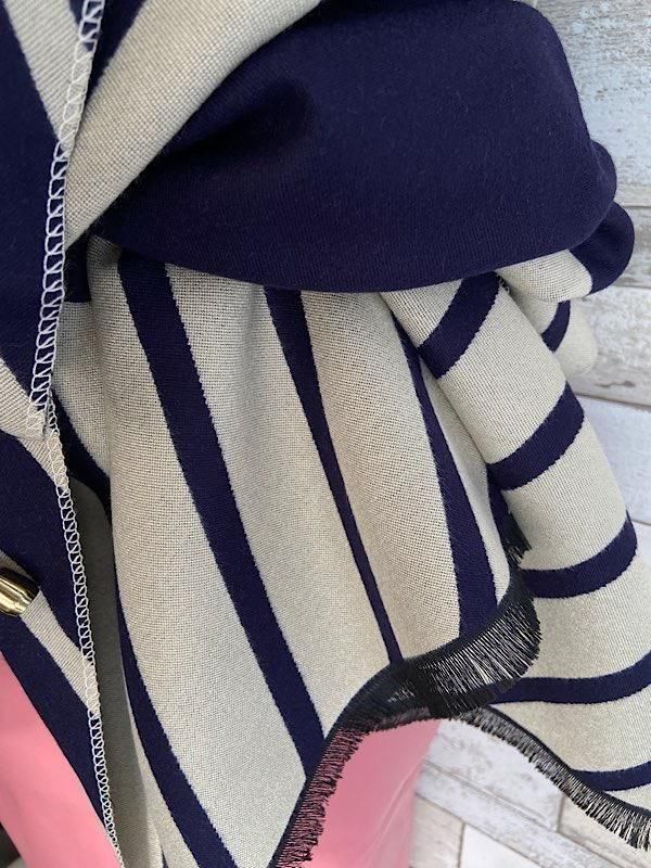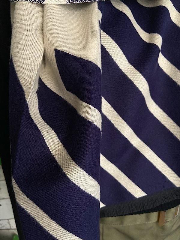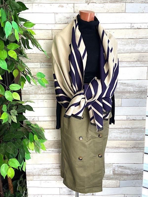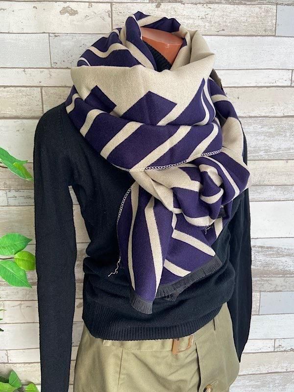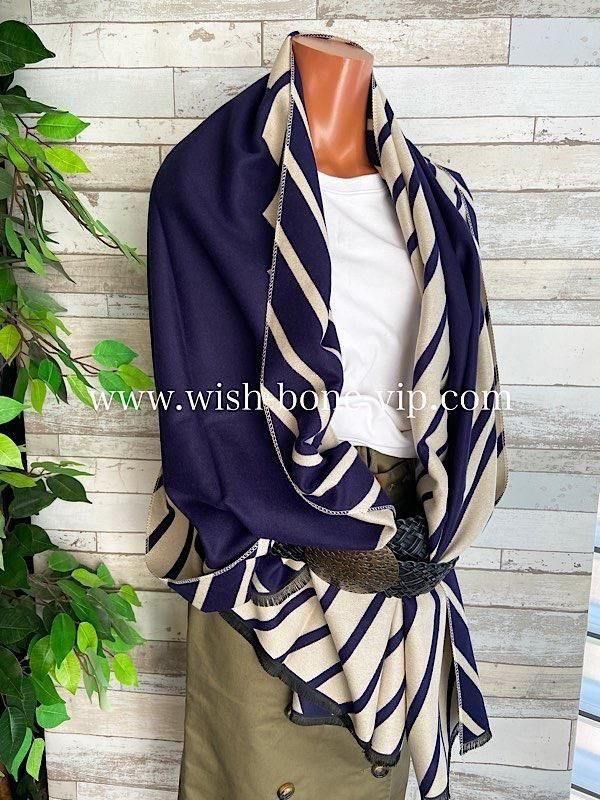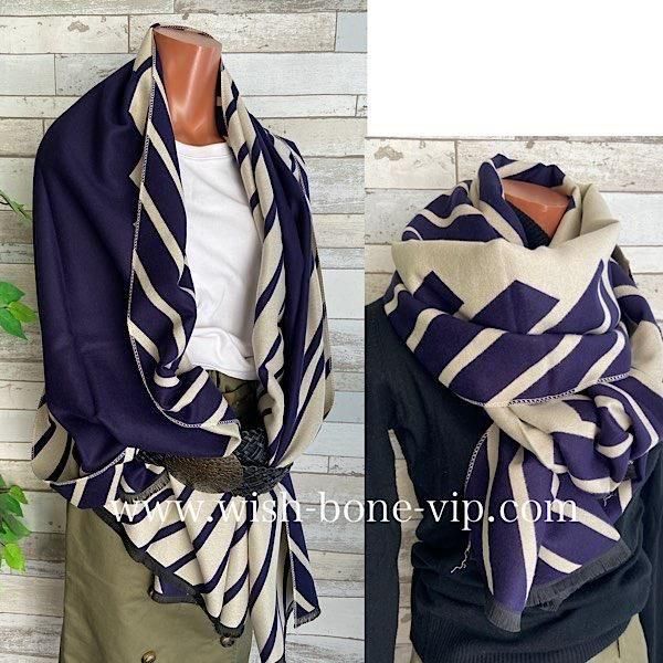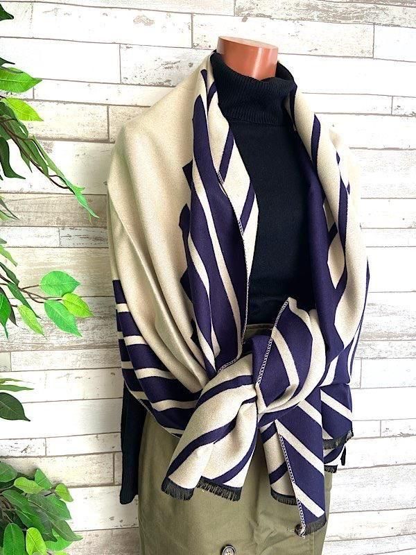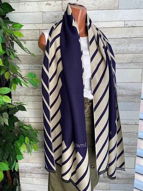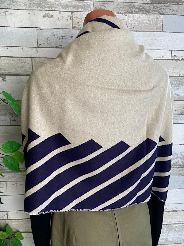 ネイビーとクリームの切り替えストライプの様な柄が羽織るだけでおしゃれな厚手のストールです。ロゴが反転しますがリバーシブルで使えると思います