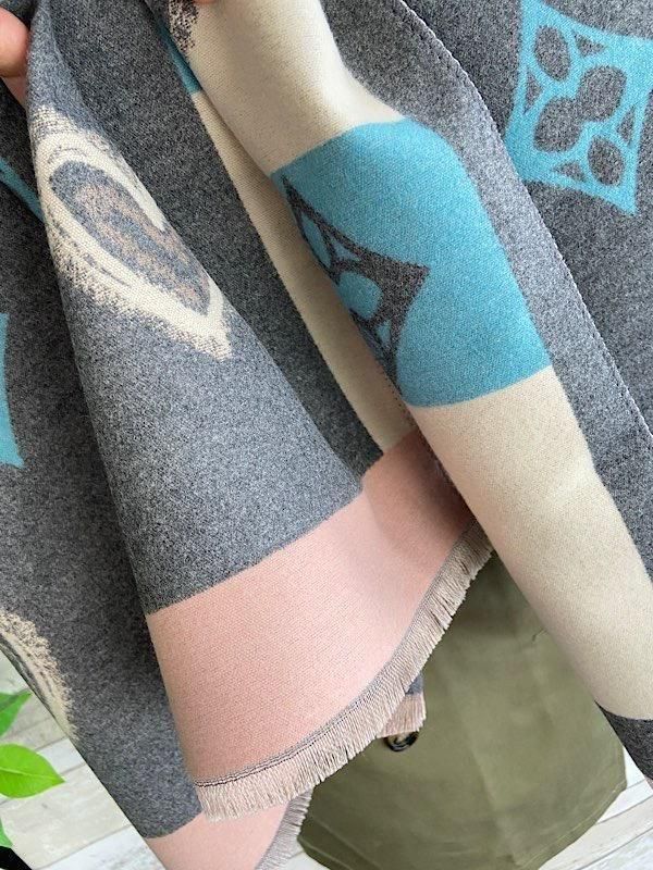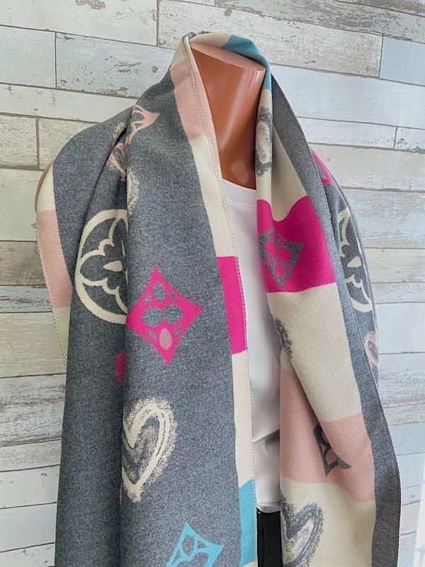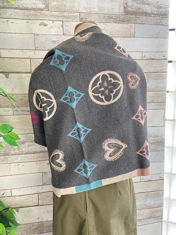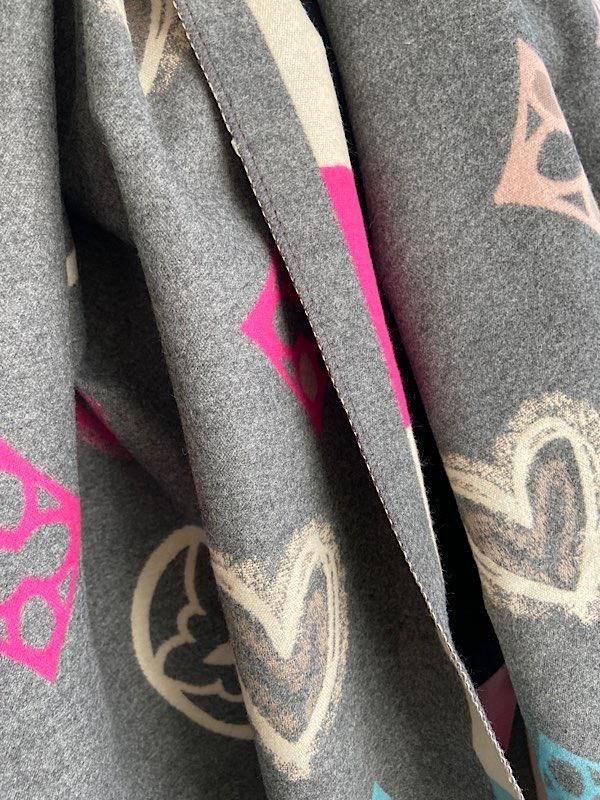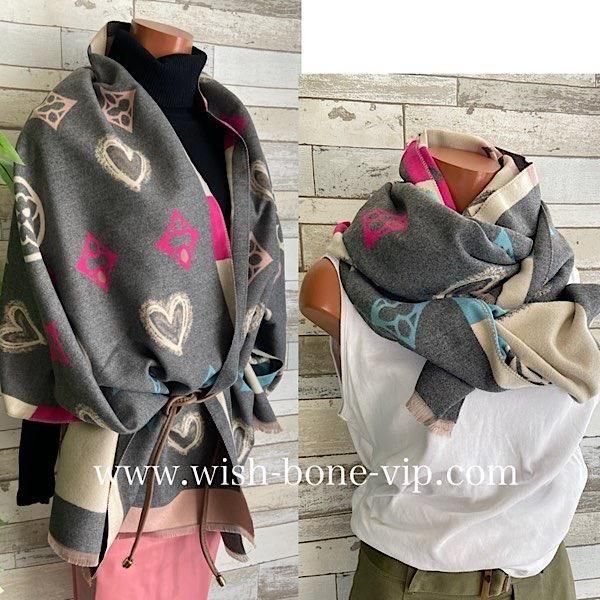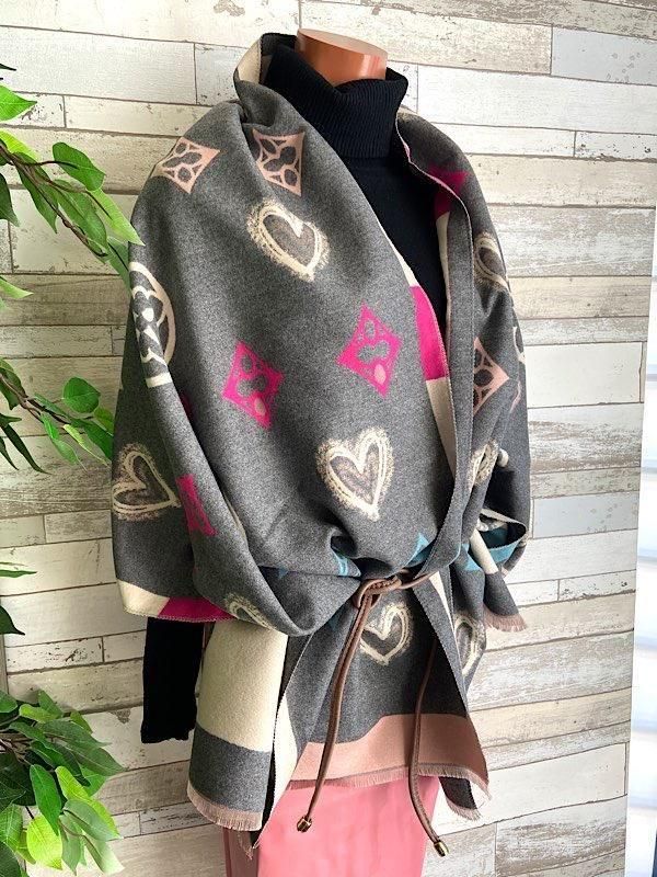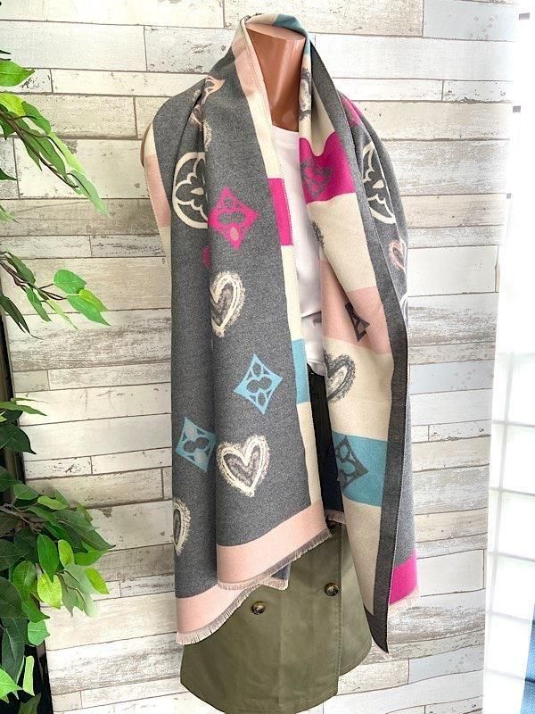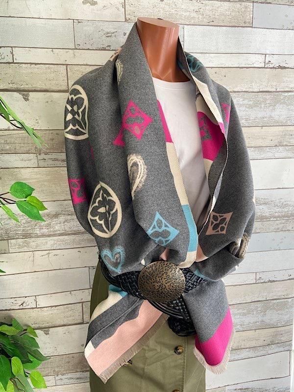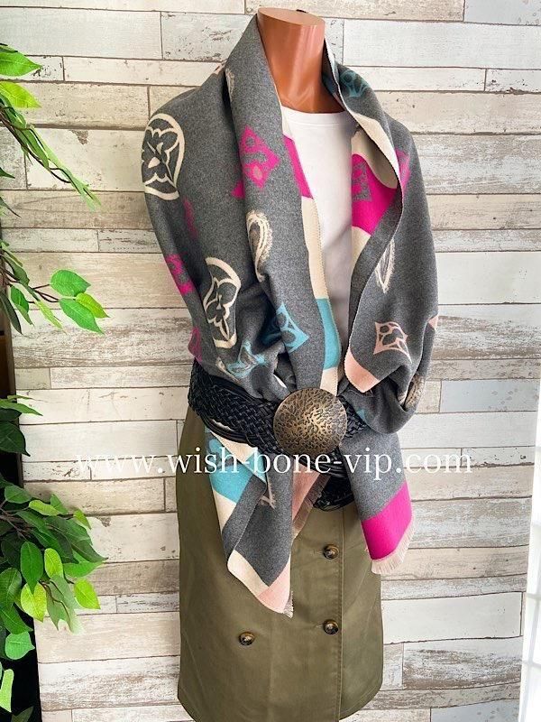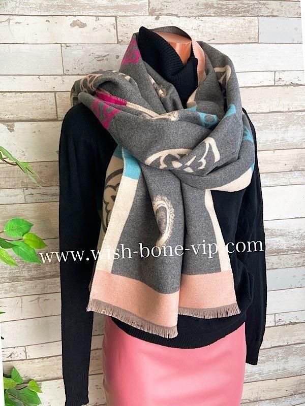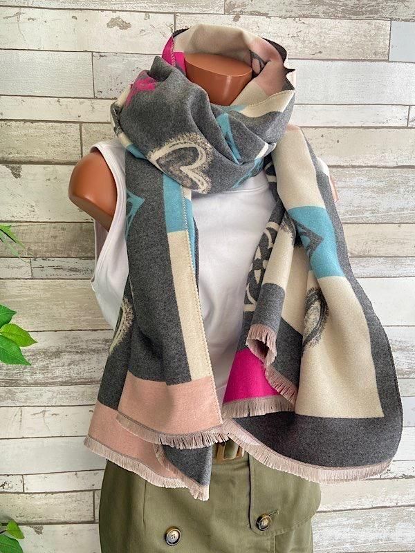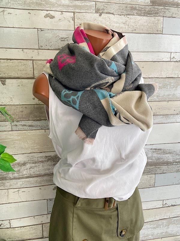 グレーとクリームにピンクやブルーの差し色がポップ!羽織るだけで楽しい厚手のストールです。リバーシブルで使えるので全然イメージ変わると思います