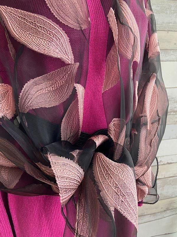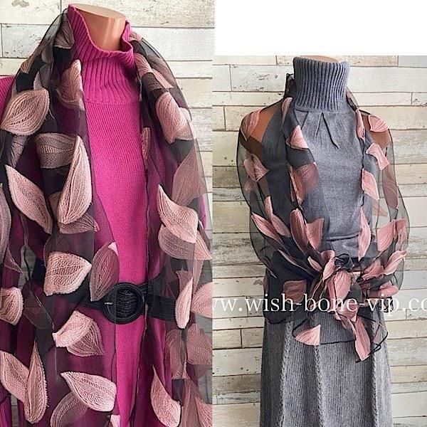 *フランスインポート|大判&ロングスカーフ・ストール|シースルー羽織りショール/ピンク葉っぱの刺繍