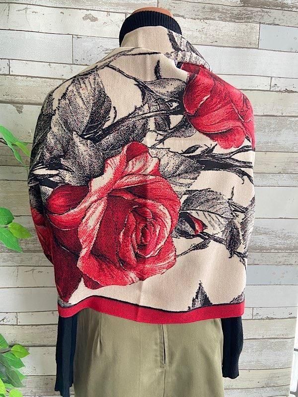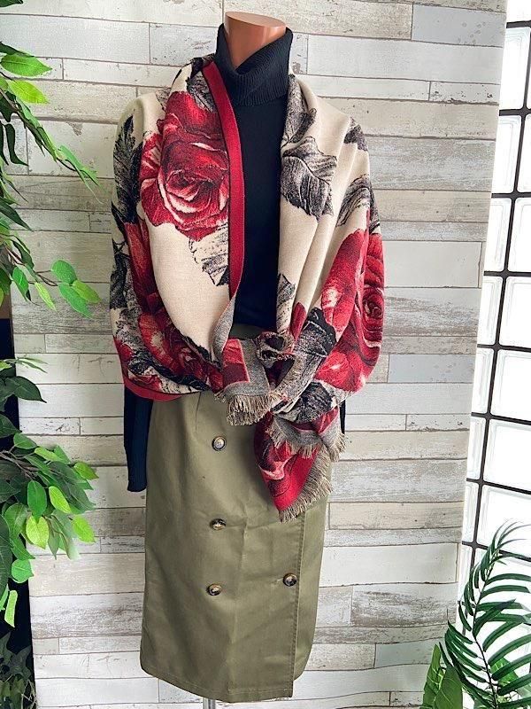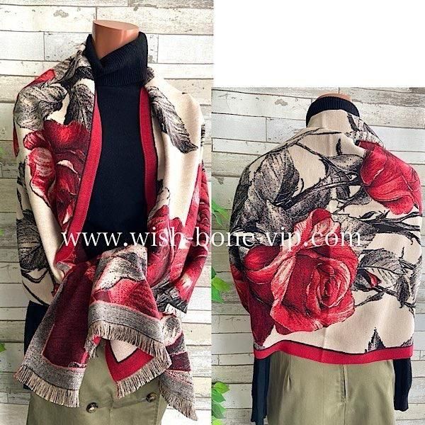 落ち着きのあるレッドROSEが羽織るだけでステキな厚手のストールです。やわらかい色めですので冬のコーディネートが明るく華やぎそうですよ。カジュアルにも良く合いそうです