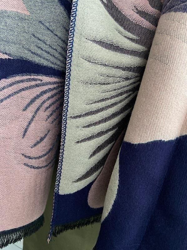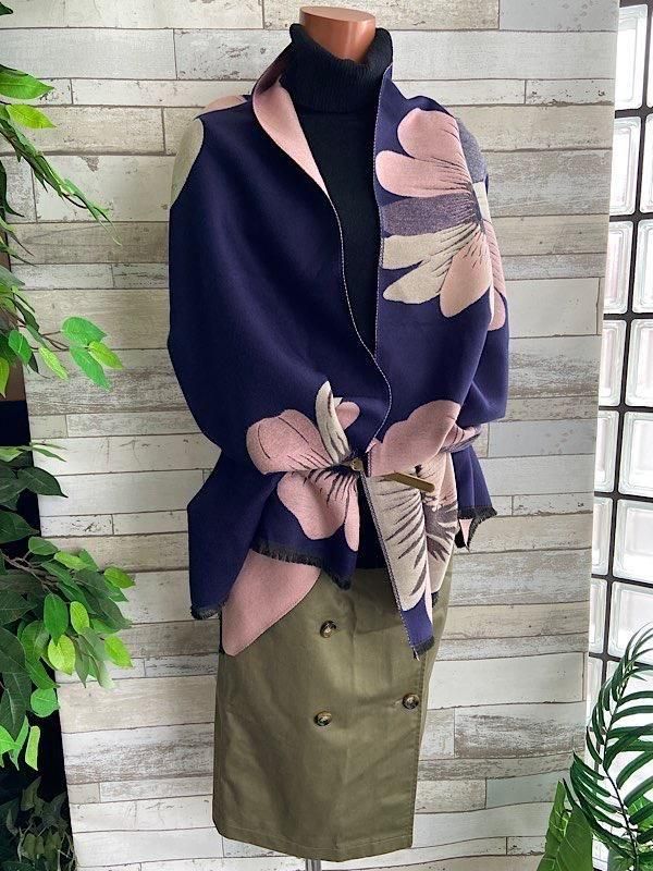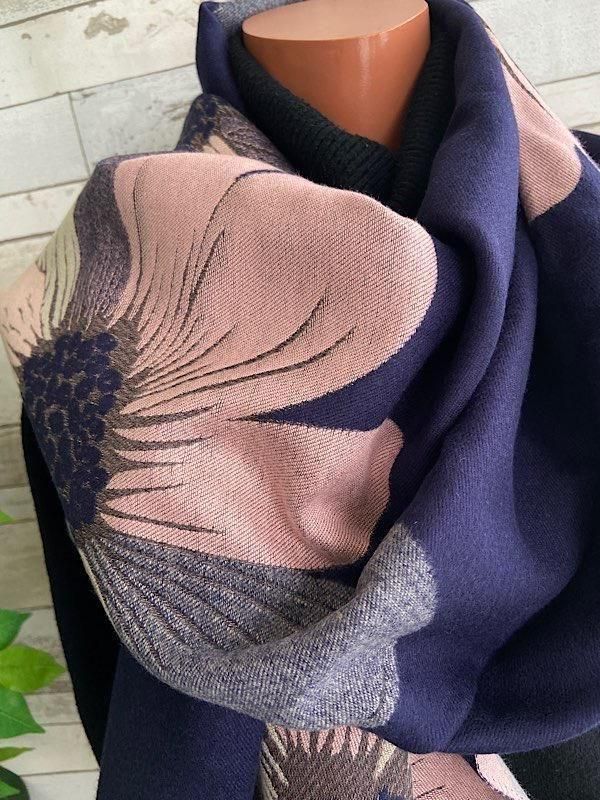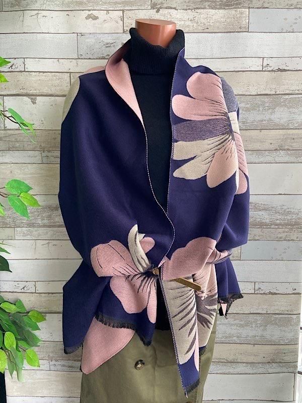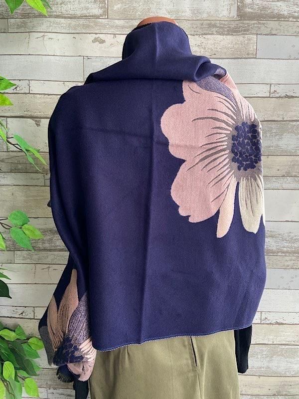 ネイビーになんとも言えないピンクのフラワーが羽織るだけでステキな厚手のストールです。やわらかい色めですので冬のコーディネートが明るく華やぎそうですよ。カジュアルにも良く合いそうです