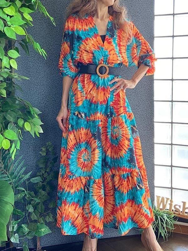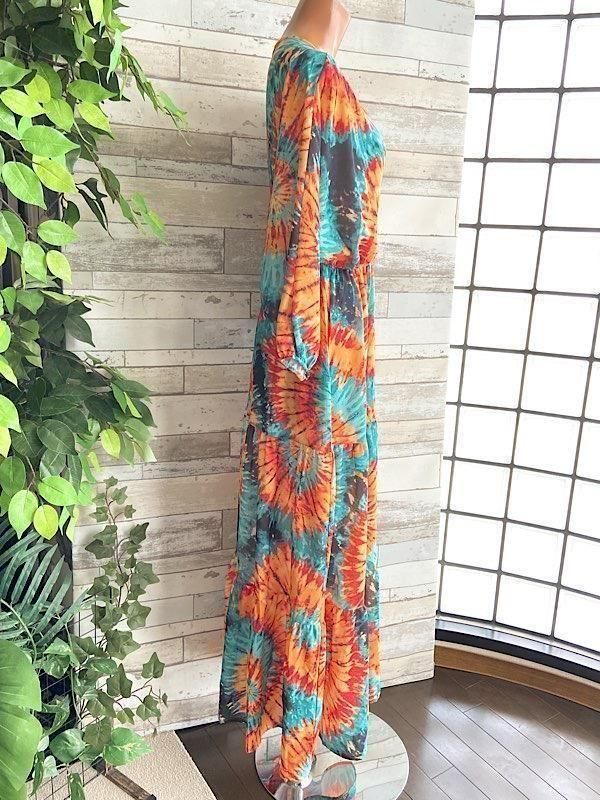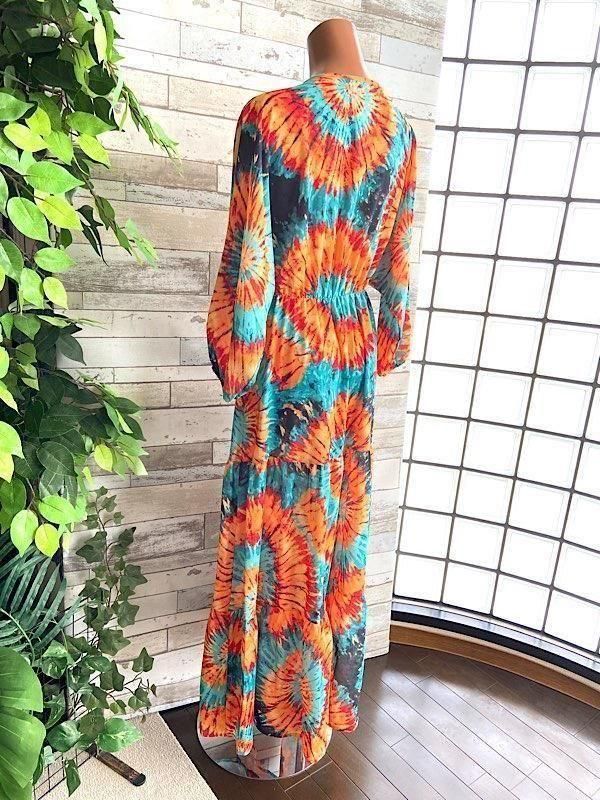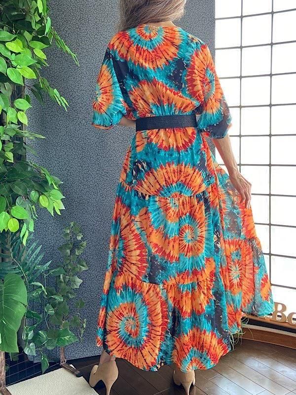 エキゾチックな魅力が詰まったアフリカンカラーがステキなロングワンピースです。華やかなオレンジとグリーンのアフリカン柄が、どこか異国情緒を感じさせますよ。