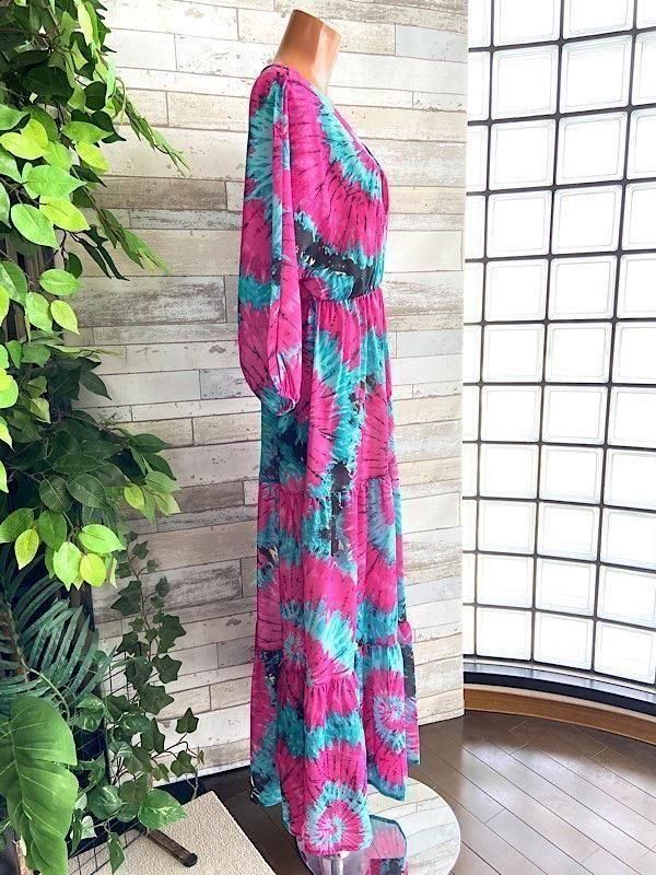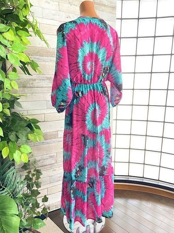 エキゾチックな魅力が詰まったアフリカンカラーがステキなロングワンピースです。華やかなピンクとブルーのアフリカン柄が、どこか異国情緒を感じさせますよ。