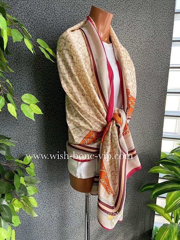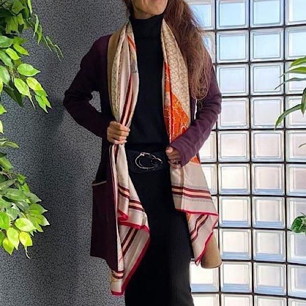 なめらかで程よいツヤっぽさがキレイめコーデに映えるかなり大判のスカーフです。サラッとしているので巻きやすく、垂らしてるだけでもオシャレですよ。夏ならパレオにしてもオシャレかも。