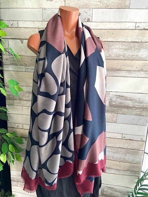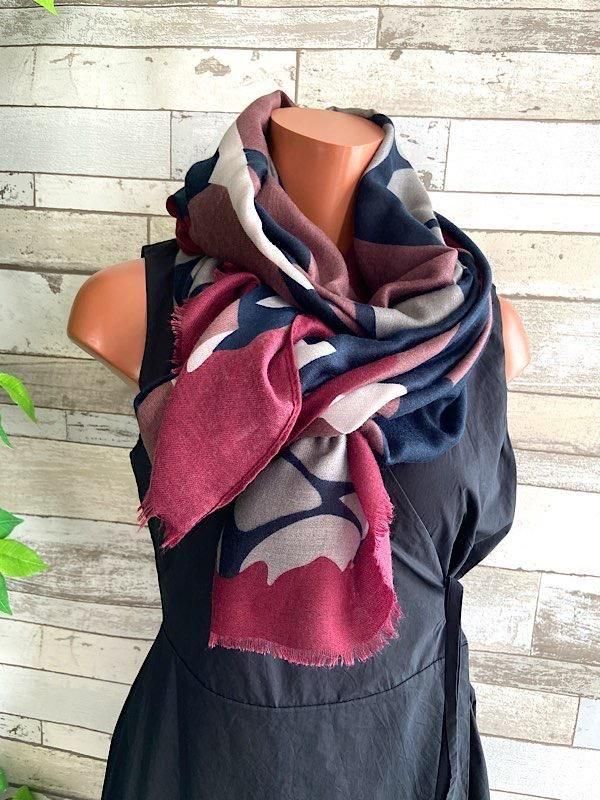 なめらかな素材が肌心地のいいストールです。すごく合わせやすい色合いだとと思います!巻いた時に左右非対処になるようなプリントも面白いですよ。