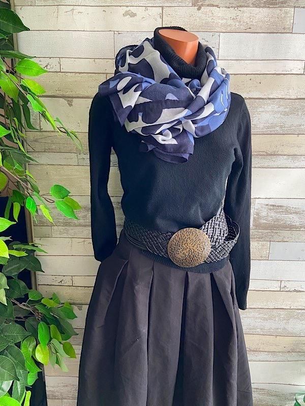 色のトーンがとてもオシャレで、カモフラっぽい柄に大きなリボンですが巻くとリボンは差し色の様になるかな。ストールの中では大判です。ビスコースはテカリなく肌触りが柔らかで心地いいですよ。