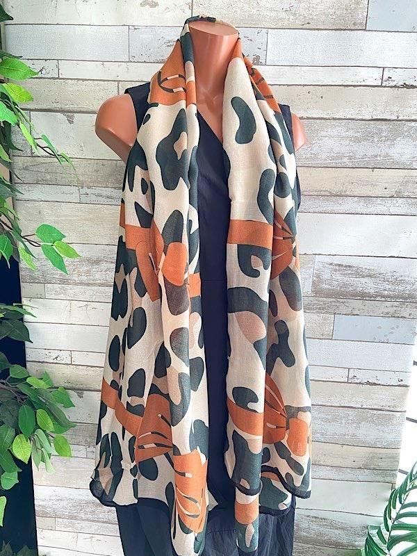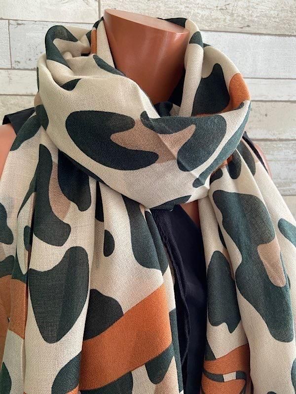 色のトーンがとてもオシャレで、カモフラっぽい柄に大きなリボンですが巻くとリボンは差し色の様になるかな。ストールの中では大判です。ビスコースはテカリなく肌触りが柔らかで心地いいですよ。