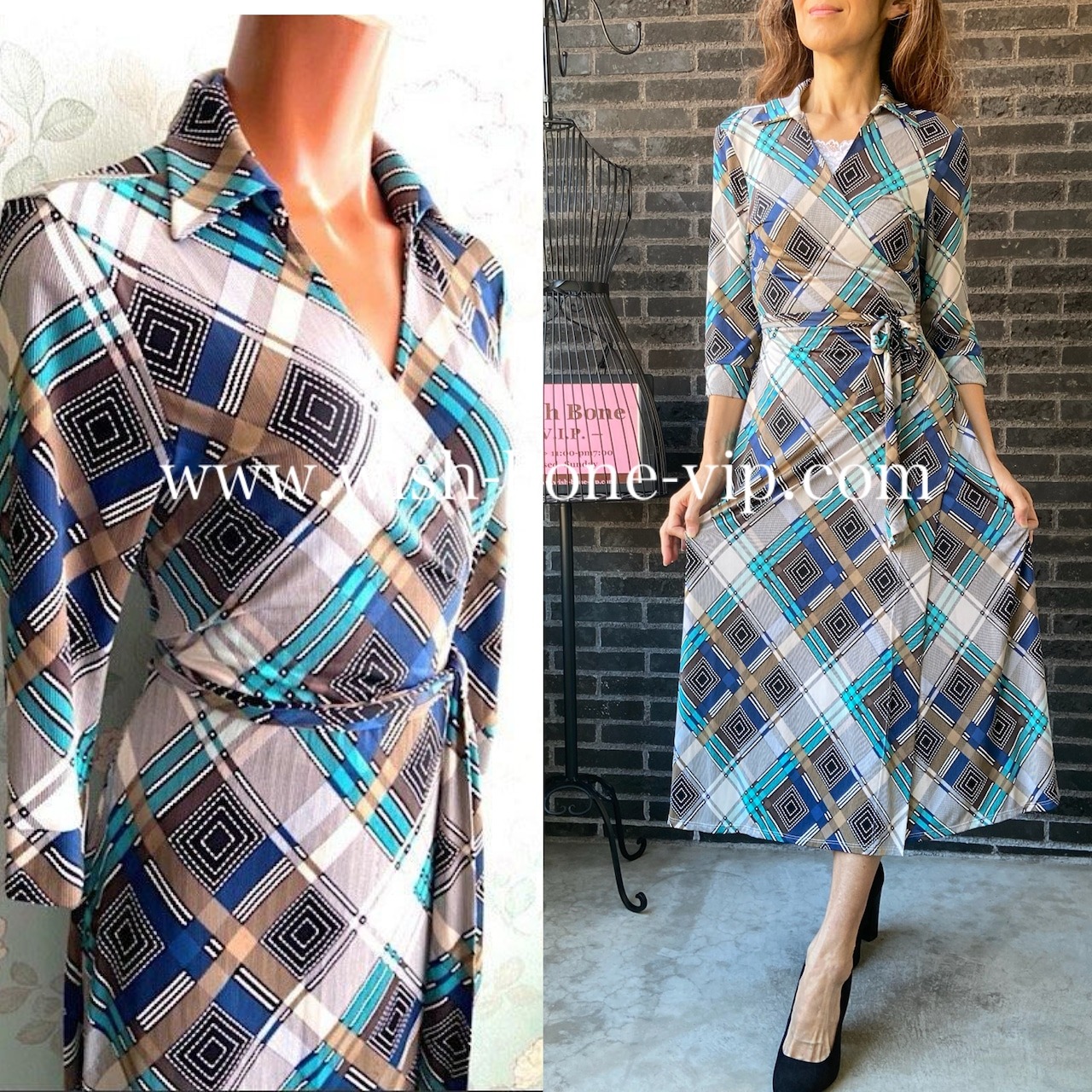 フランス製インポートワンピース|FRANCE ラップ巻き&えり付き・シャツワンピース|七分袖ロングワンピース/ブルー系(S)