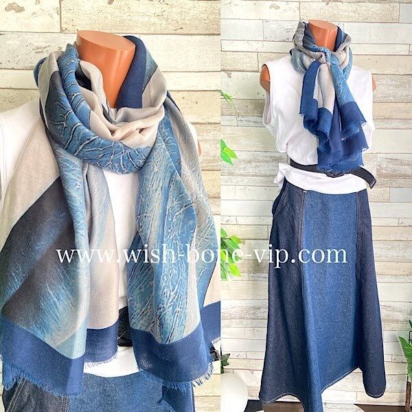 ブルー系のグラデーションがとてもきれいでオシャレな大判ロングストール。滑らかで軽く、肩から羽織ったり、ちょっと垂らしたりなど便利に使いやすいです。バッグに1枚入れてると急に寒いや急にコーデを変えたい時にも良いかも。