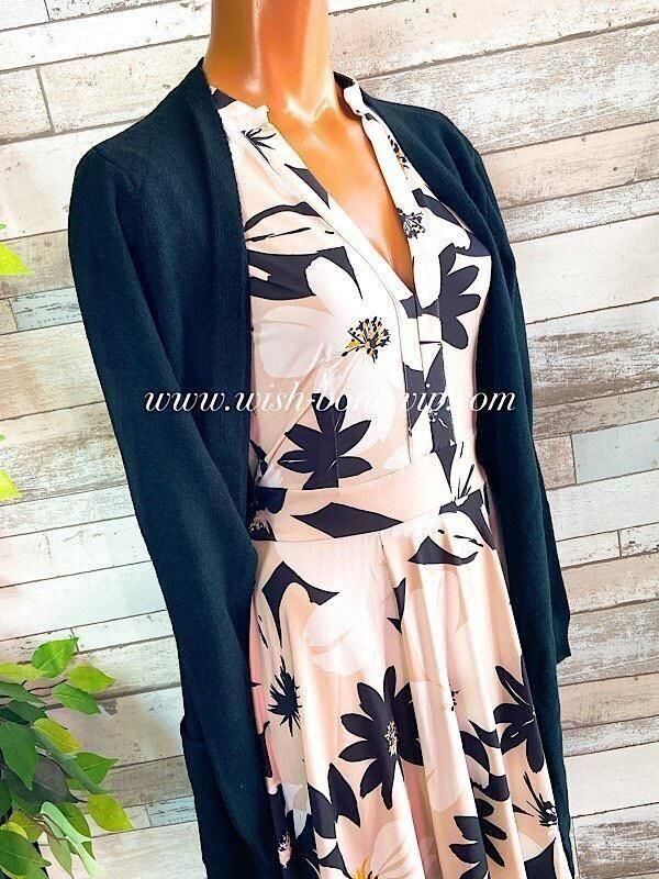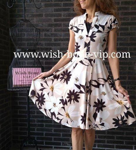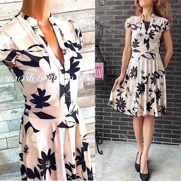 ちょっとスタンドカラーのような感じのネックラインで、ただ単にパックリ開くVではないのもオシャレ。お袖のデザインも、パフスリーブっぽく凝っていて、ウエストからの切り替えたっぷりな生地のAラインが歩くたびに足元でゆらゆら~綺麗に見えるワンピースです。