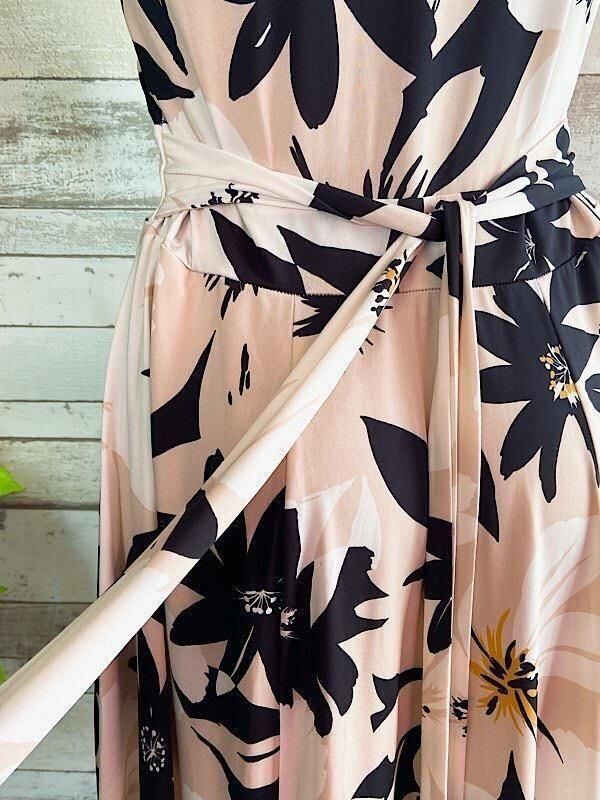 胸元は私のように貧弱だと、まっすぐスリットっぽいですが、バストが有ればもう少しVネックな感じに開くかと思います。少しエリのようなデコルテが、とても上品で、ウエストはリボンをくくってお好きに調節できます。