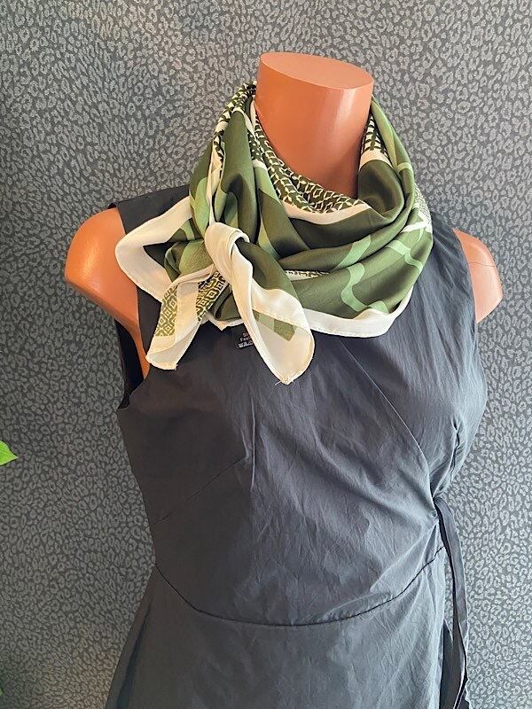 程よいツヤがキレイなヨーロッパで人気のスカーフ。紫外線が気になる首元や室内でアクセサリー感覚にちょこっと巻いたり。飽きてきたらバッグにぐるぐるっと巻いたり。。素材のツヤ感がドレッシーになり、大人のカジュアルをキレイにカッコよくまとめてくれるマストアイテム!ワンポイントにおすすめです。