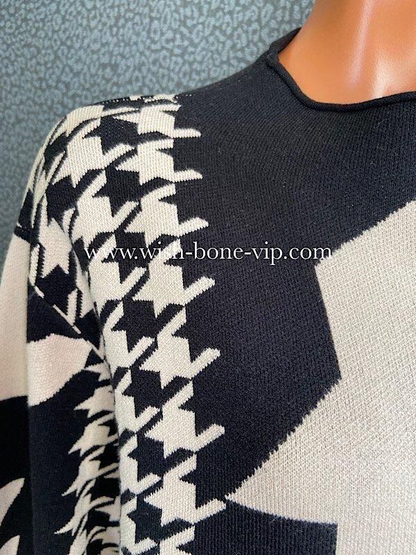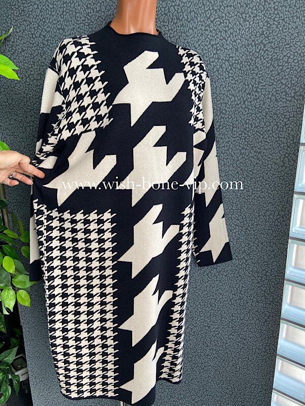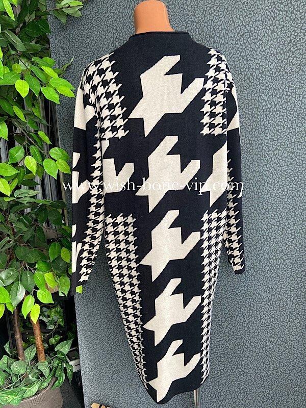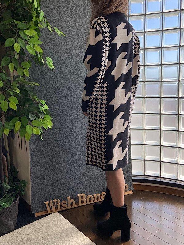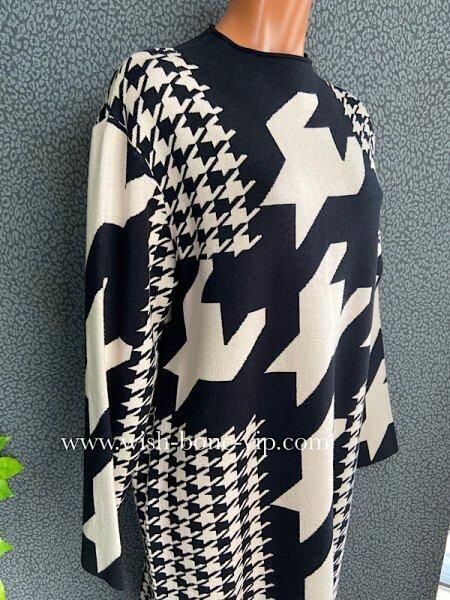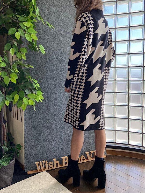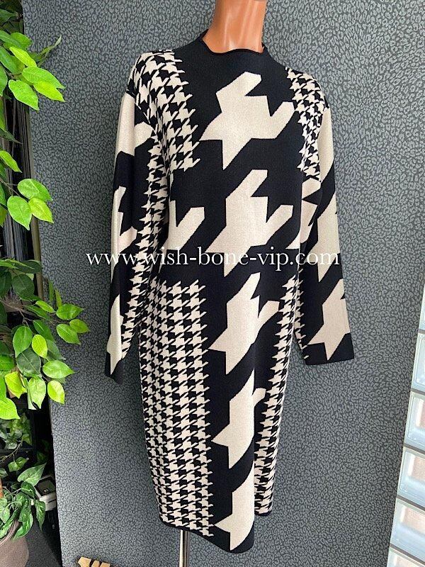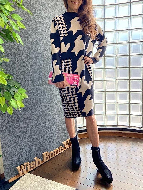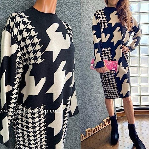 イタリア製ワンピース Made in ITALY|モードなきれいめカジュアル 千鳥格子 厚手冬物ニット モノトーン