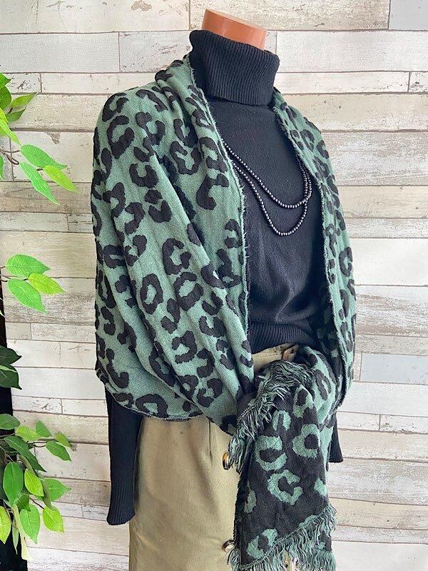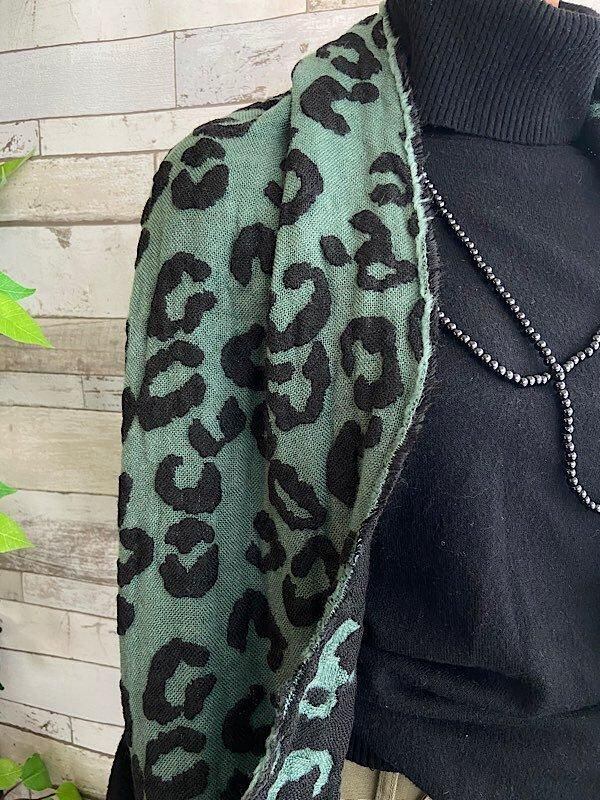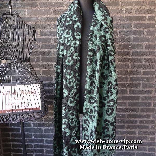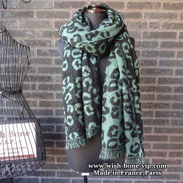 SALE 【フランスインポート】190㎝大判&ロング| 暖かい冬物 ストール・ショール/レオパード風グリーン、リバーシブル