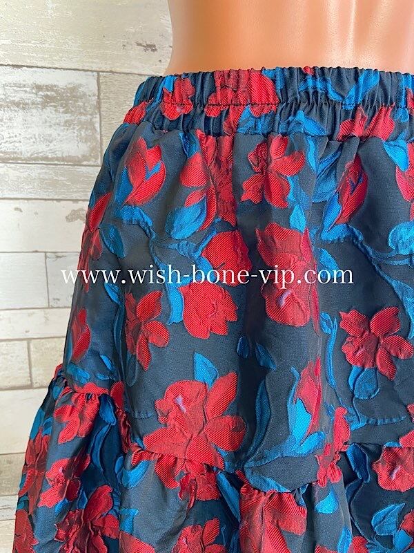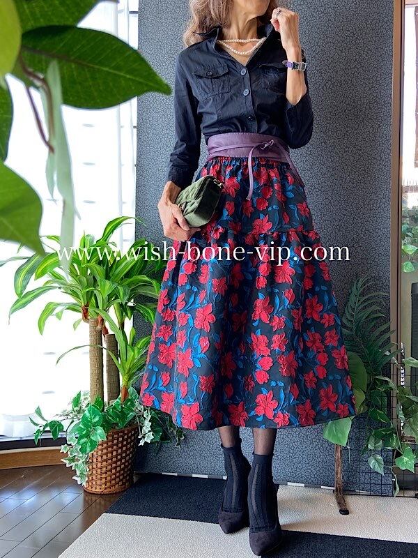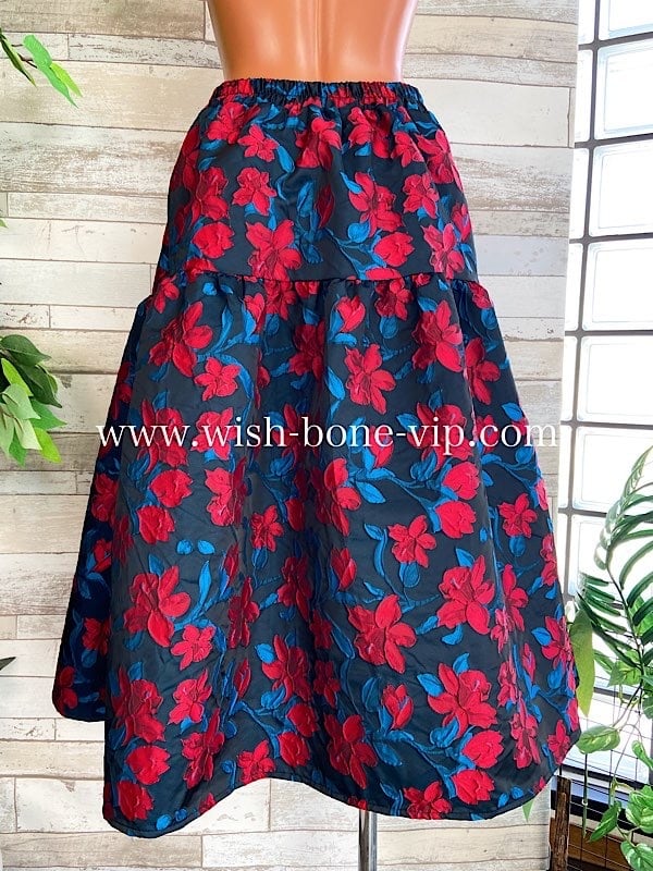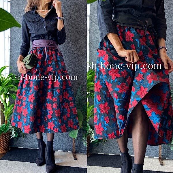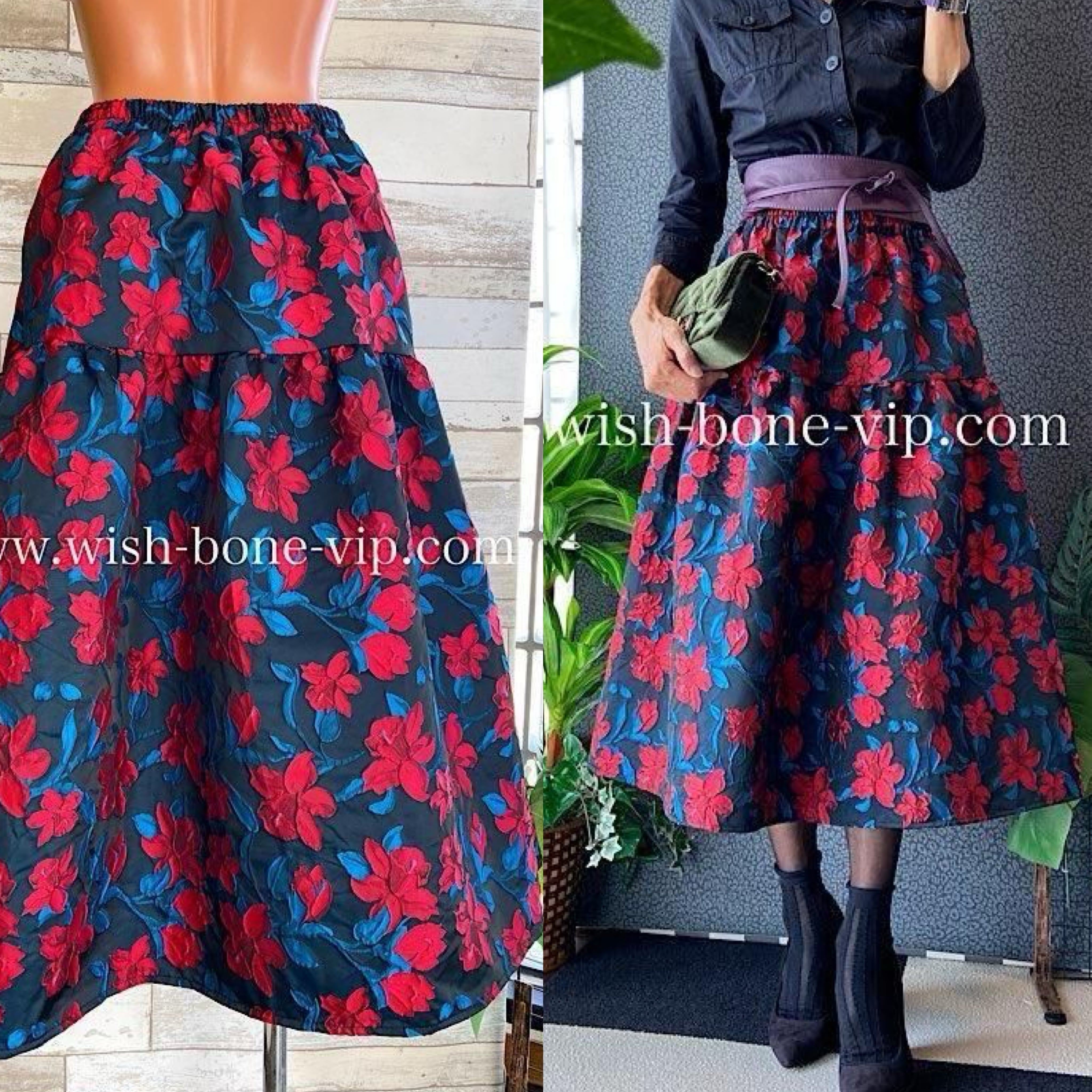 厚地&ツヤ・切り替えティアード ロング・ミディアム丈スカート|ブラック&レッド・ブルーフラワー