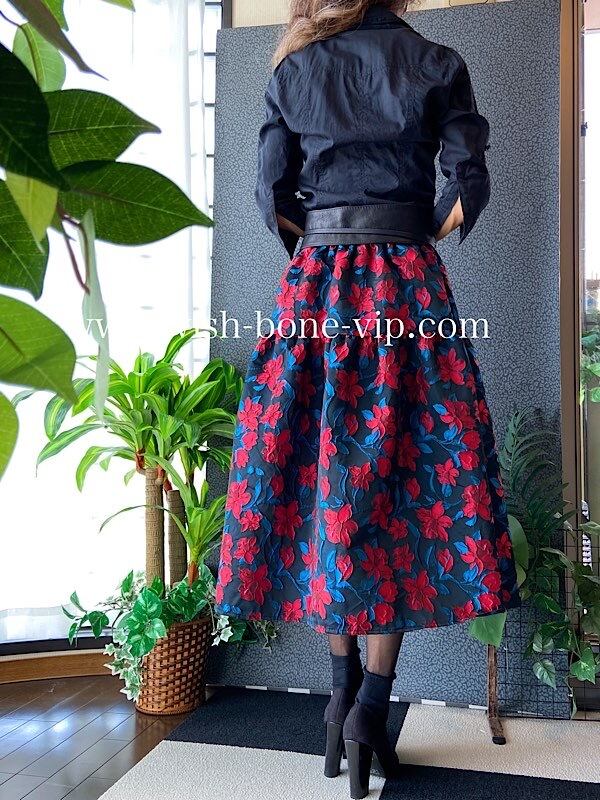 お花が浮いたような織り生地の立体感のある素材は、着ていても見ていてもうっとりするようなステキなスカートですよ。