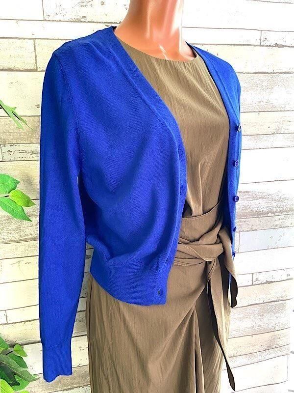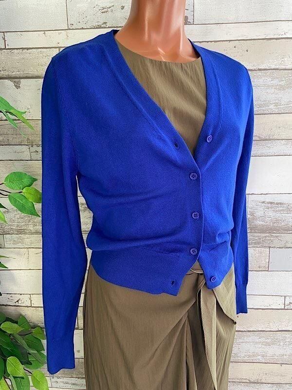 滑らかな素材と細身のシルエットがとてもきれいなカーディガンです。ボタン留めるとVネックと絞られたウエストラインがスタイル良く見せてくれますよ。もちろんボタンは留めずに羽織るだけでもOKです。肩からちょっとかけるように羽織ったりなどカーディガンは何色か持ってると便利です。
