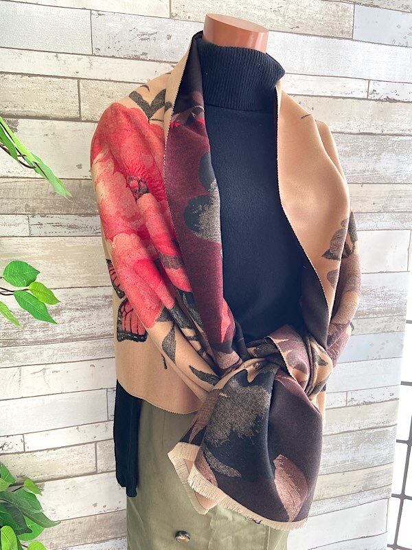 ベージュブラウンにフラワーとバタフライが羽織るだけでステキな厚手のストールです。リバーシブルではないですけど裏側でも使えるかも!もっとダークな感じで全然イメージ変わると思います
