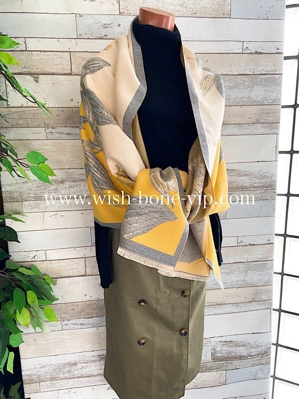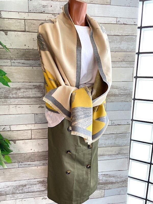 イエローとグレー,ベージュの色合いが羽織るだけでステキな厚手のストールです。やわらかい色めですので冬のコーディネートが明るく華やぎそうですよ。カジュアルにも良く合いそうです