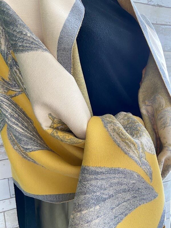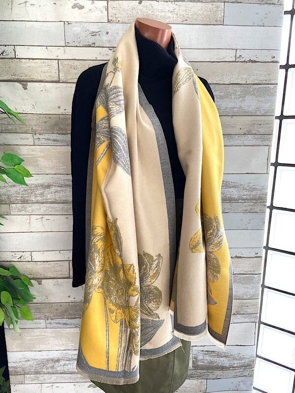 SALE 185cm大判&厚手 ロングストール・ショール・膝掛け・肩掛け/イエローベージュ&グレーフラワー