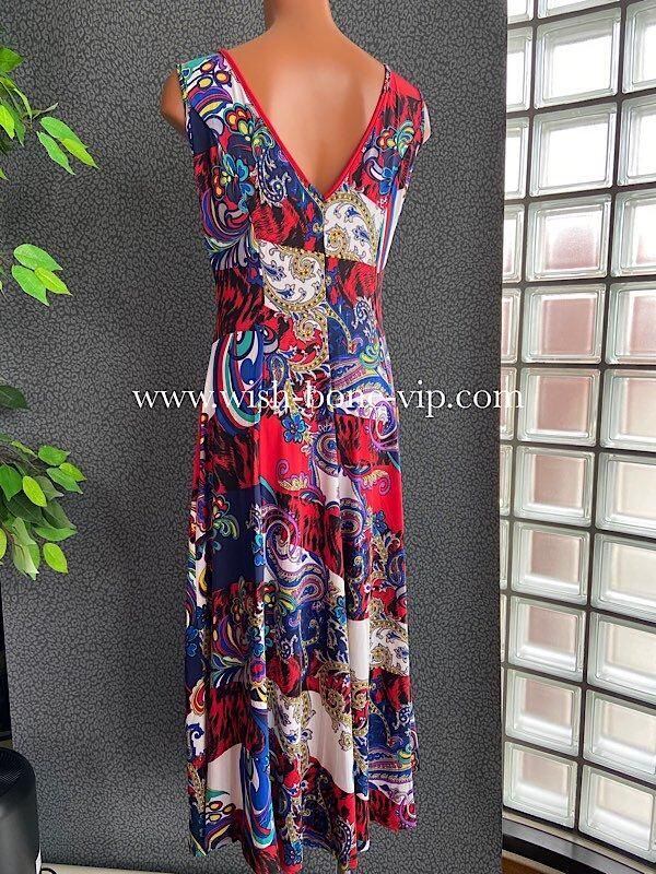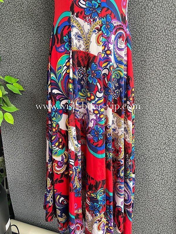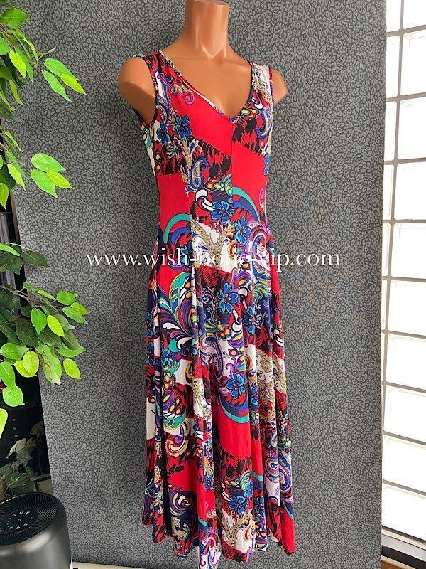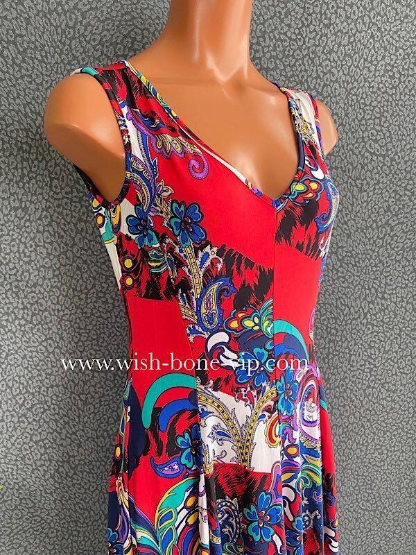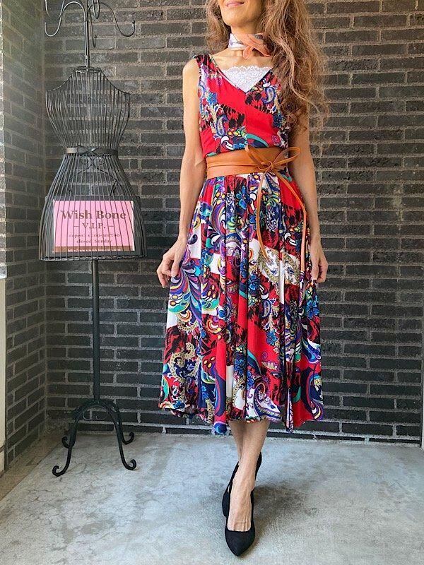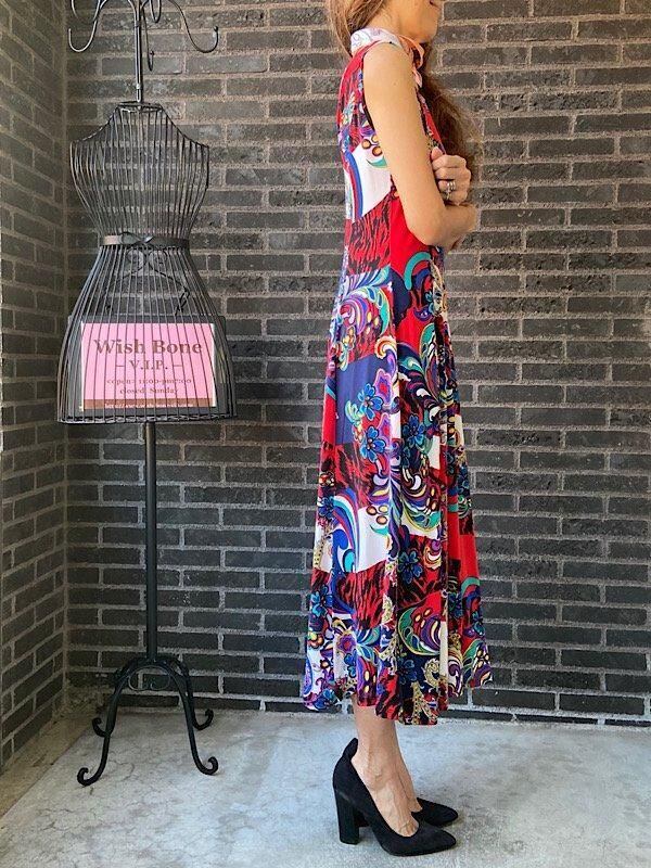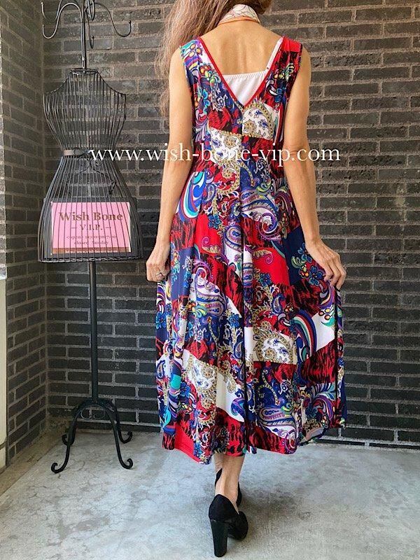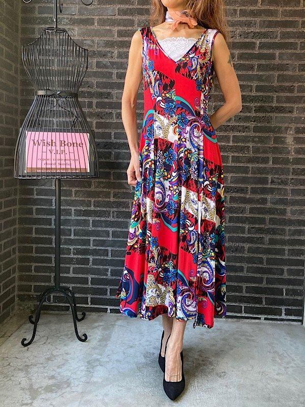 フランス製インポート・ロング丈マキシワンピース|フレアAライン・ストレッチ製ジャージ/レッド系プリント