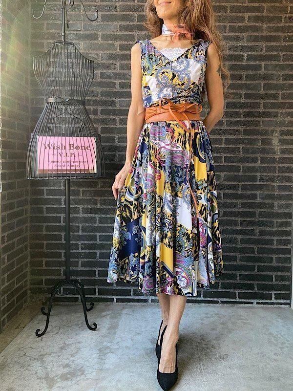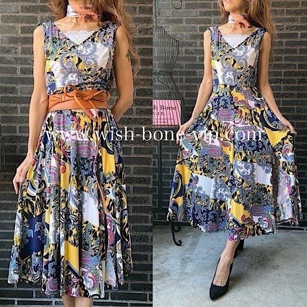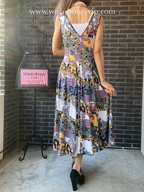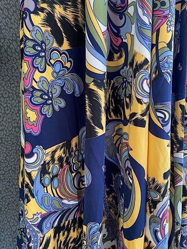 フランス製インポート・ロング丈マキシワンピース|フレアAライン・ストレッチ製ジャージ/イエロー系プリント