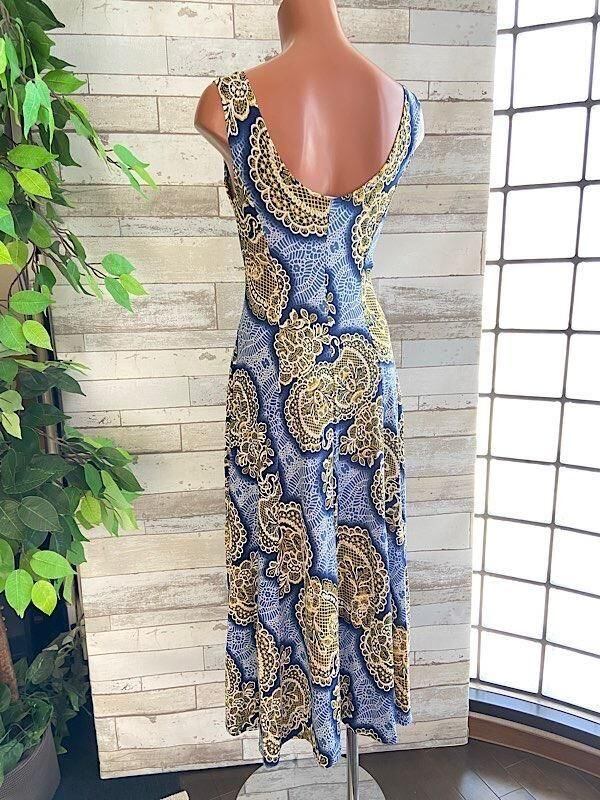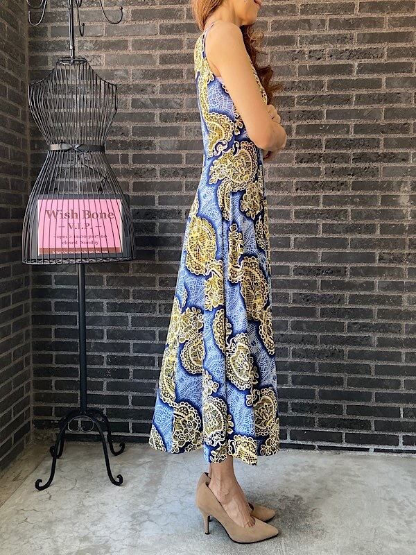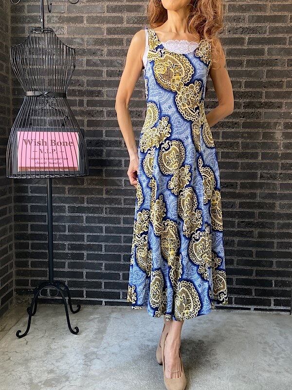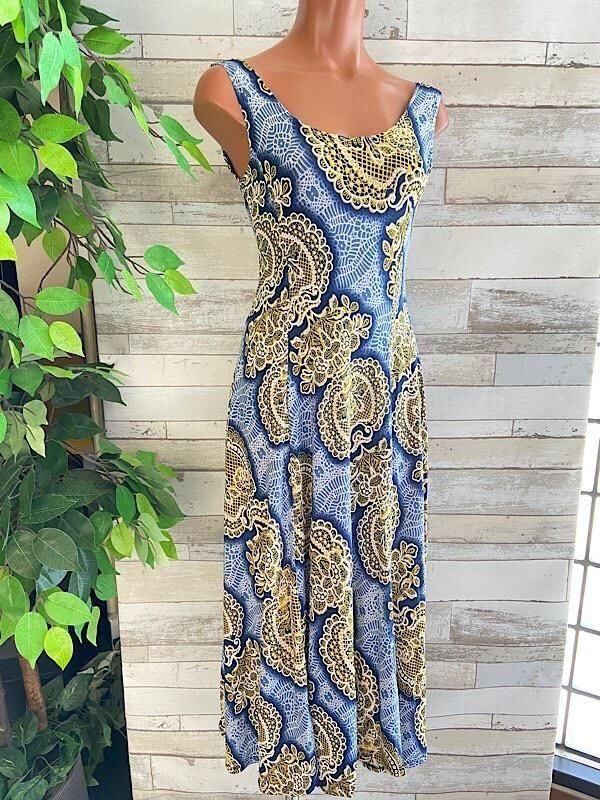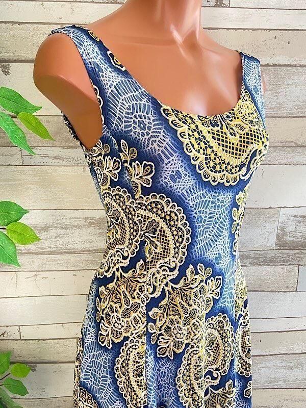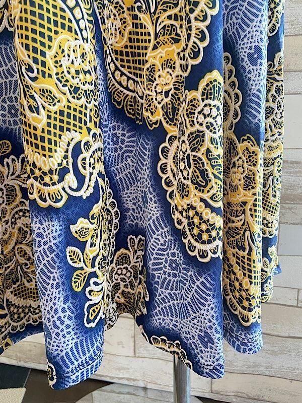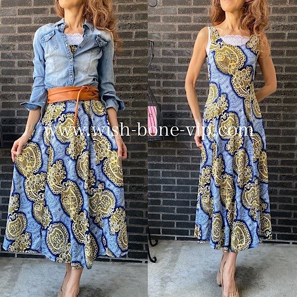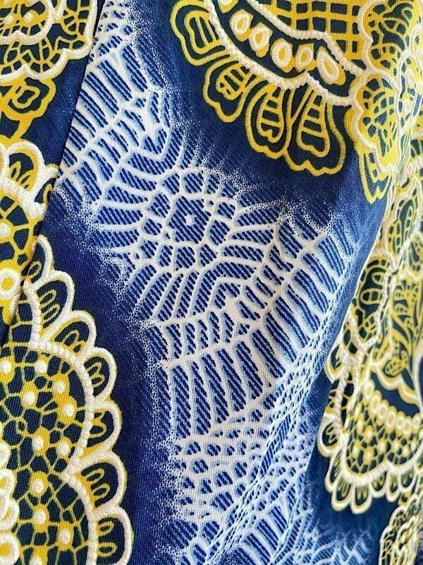 黄)フランス製インポート・ロング丈マキシワンピース|フレアAライン・ストレッチ製ジャージ/ブルー&万華鏡イエロー