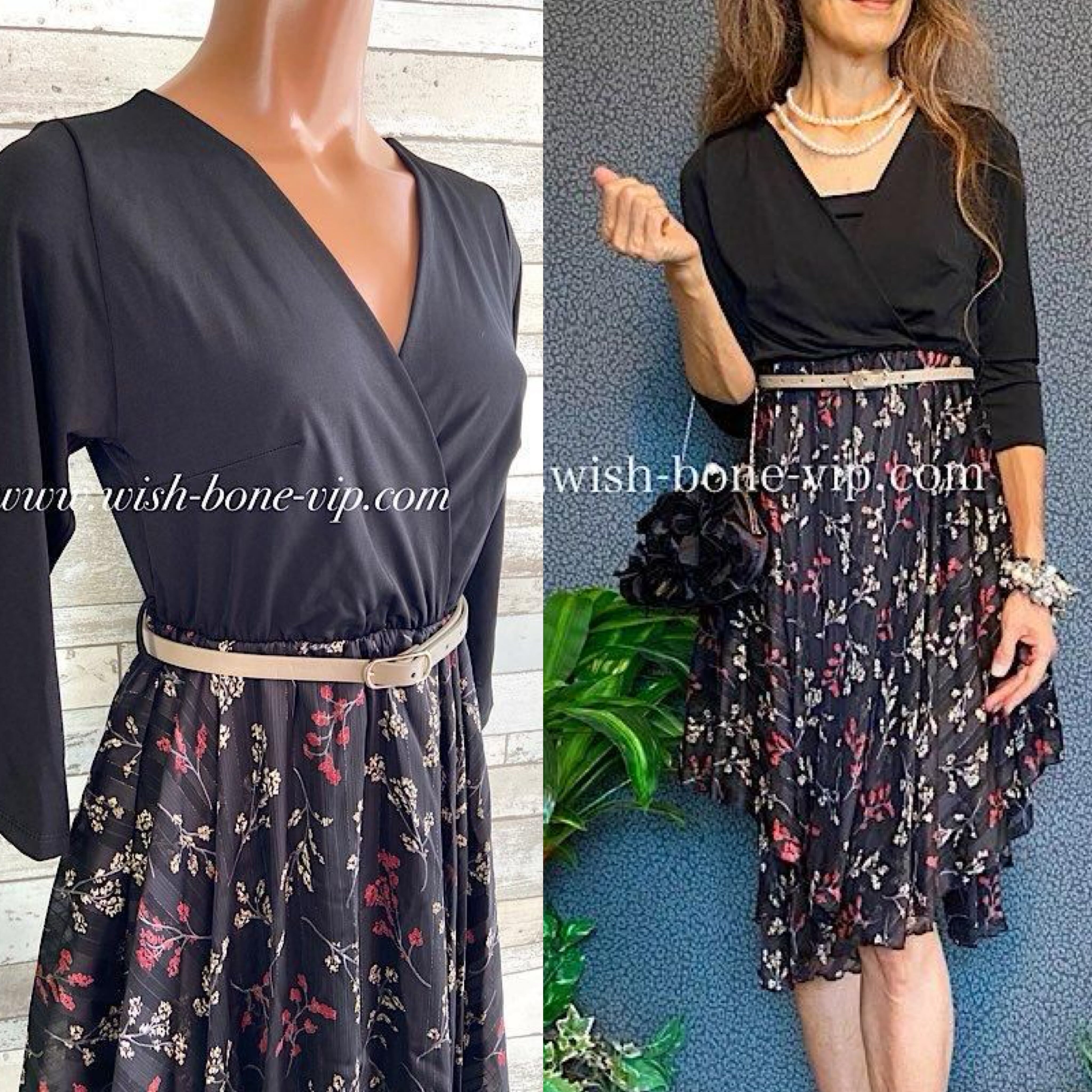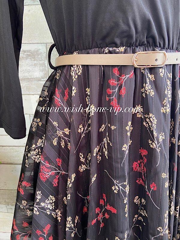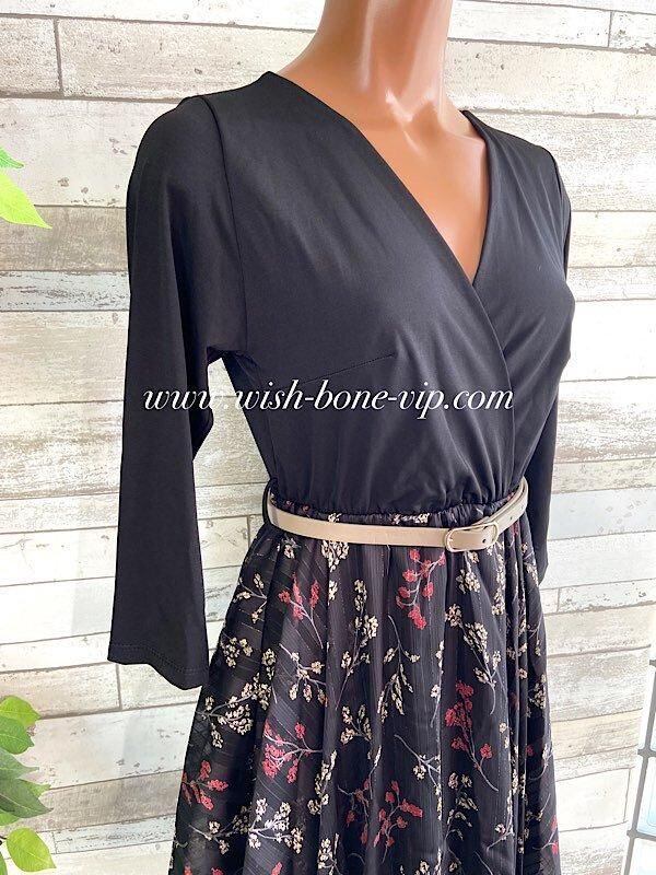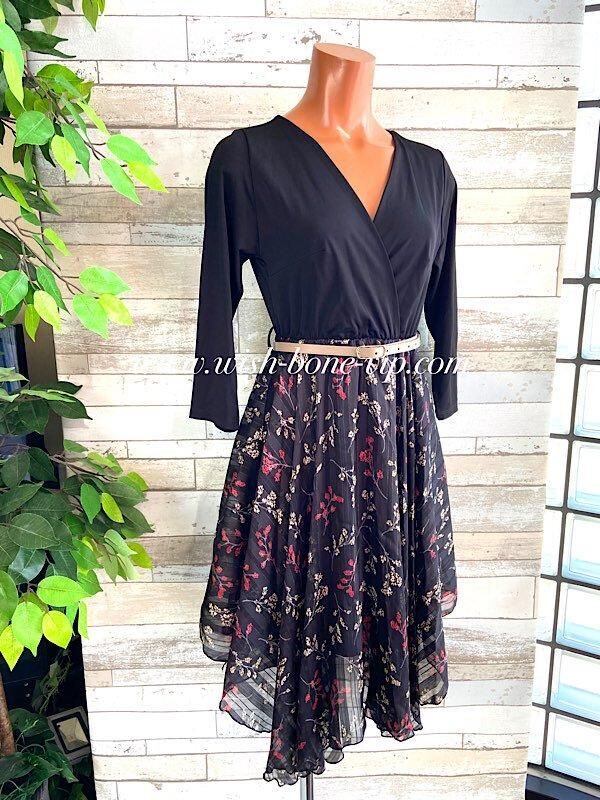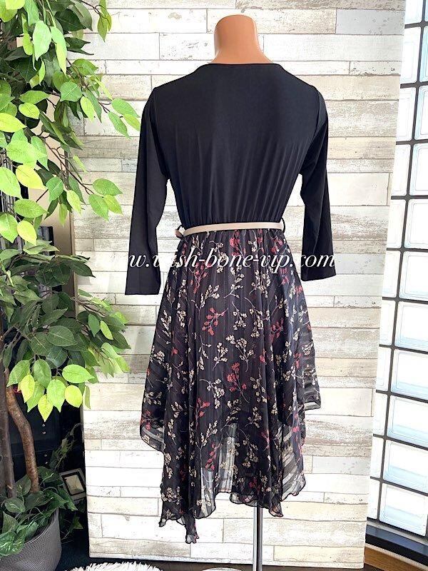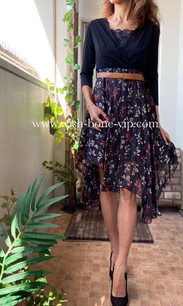 イタリア製ドレス・ワンピース 二次会・イベント・パーティードレス 七分袖&切り替え すそアシンメトリーワンピース-おまけベルト付き