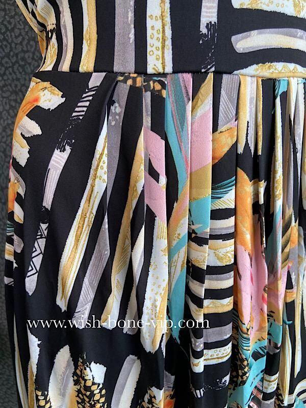 胸元は開きすぎずのVネックで、デコルテがスッキリ綺麗に。ウエスト切り替え部分には少しプリーツが有るので気になるお腹のあたりもやぼったくならずにカバーしてくれます。またウエストの横の広めのリボンベルトでくくると、お好きなウエスト幅にも調節できるので、スタイル良く着れるバランスのいいワンピースです。