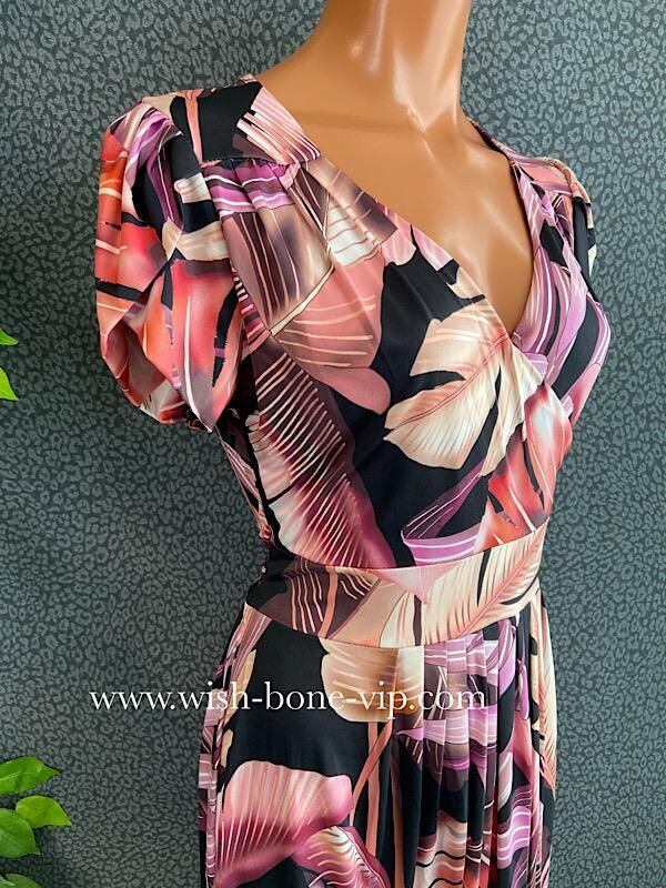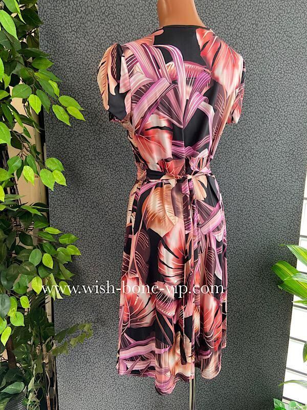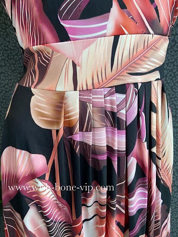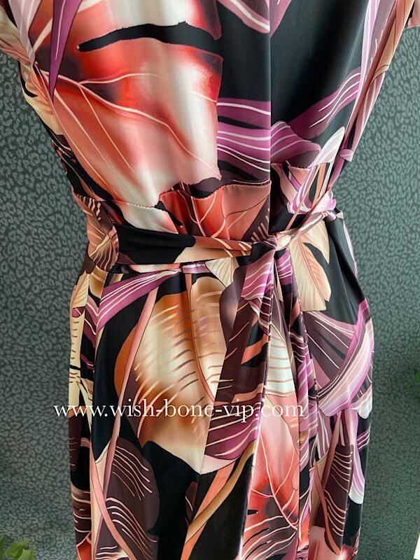 胸元は開きすぎずのVネックで、デコルテがスッキリ綺麗に。ウエスト切り替え部分には少しプリーツが有るので気になるお腹のあたりもやぼったくならずにカバーしてくれます。またウエストの横の広めのリボンベルトでくくると、お好きなウエスト幅にも調節できるので、スタイル良く着れるバランスのいいワンピースです。