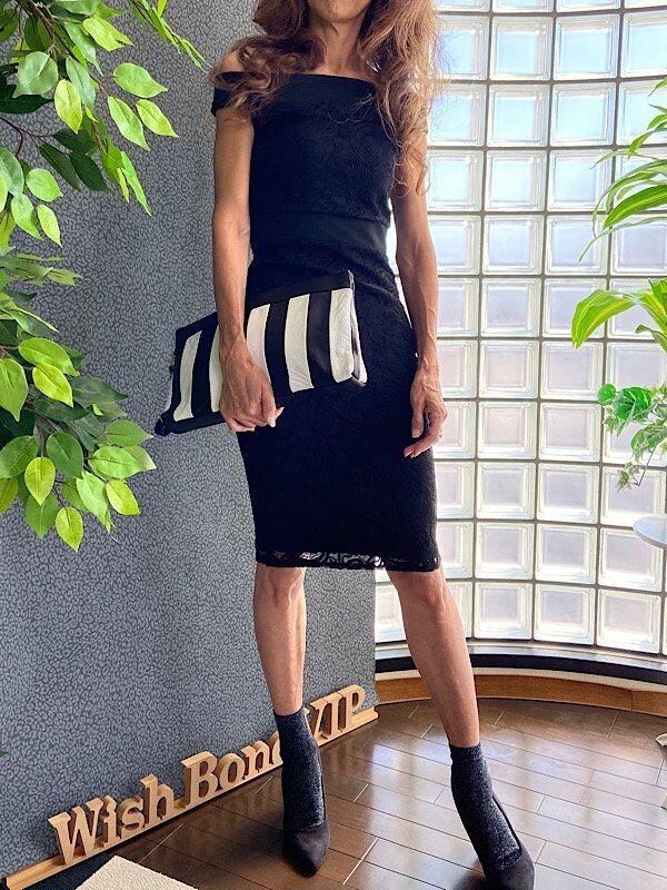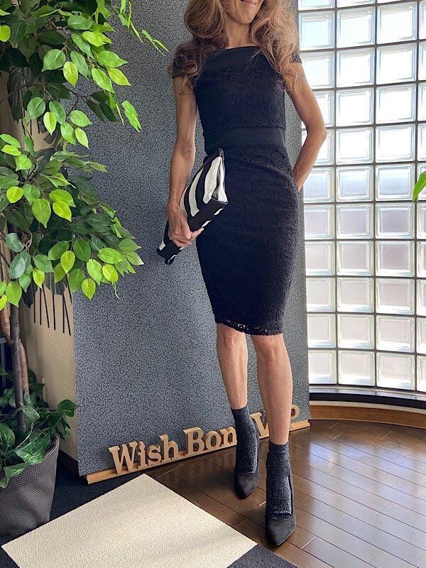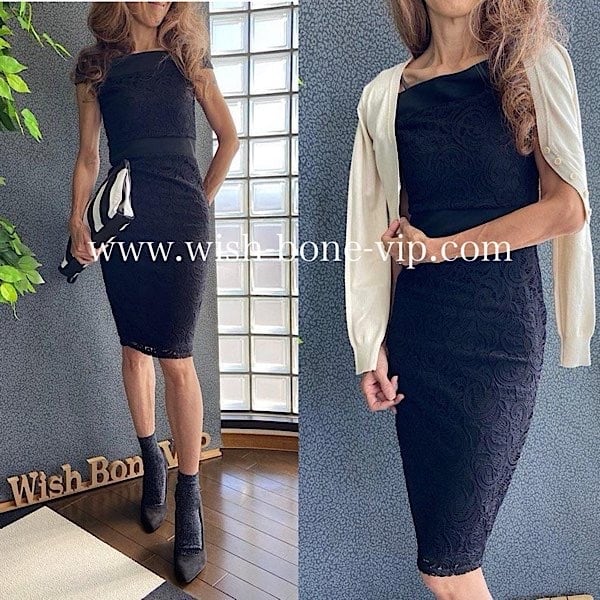 シンプルなブラックレースのタイトワンピースは、なんと言ってもシルエットが決めてです。丈もちょうど良い膝ぐらいの長さで上品ですよ。結婚式や二次会パーティーなどで重宝しそうです。またジャケットと合わせてお仕事でもおすすめです