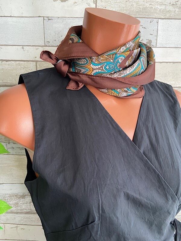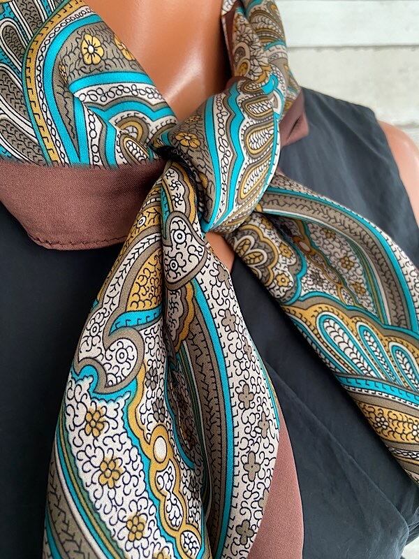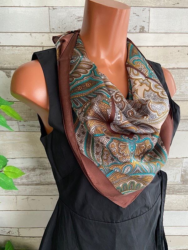 【イタリアインポート】 67x67cm スクエア アレンジ小さめスカーフ ツヤスカーフ・バッグスカーフ/ブラウン系ペイズリー
