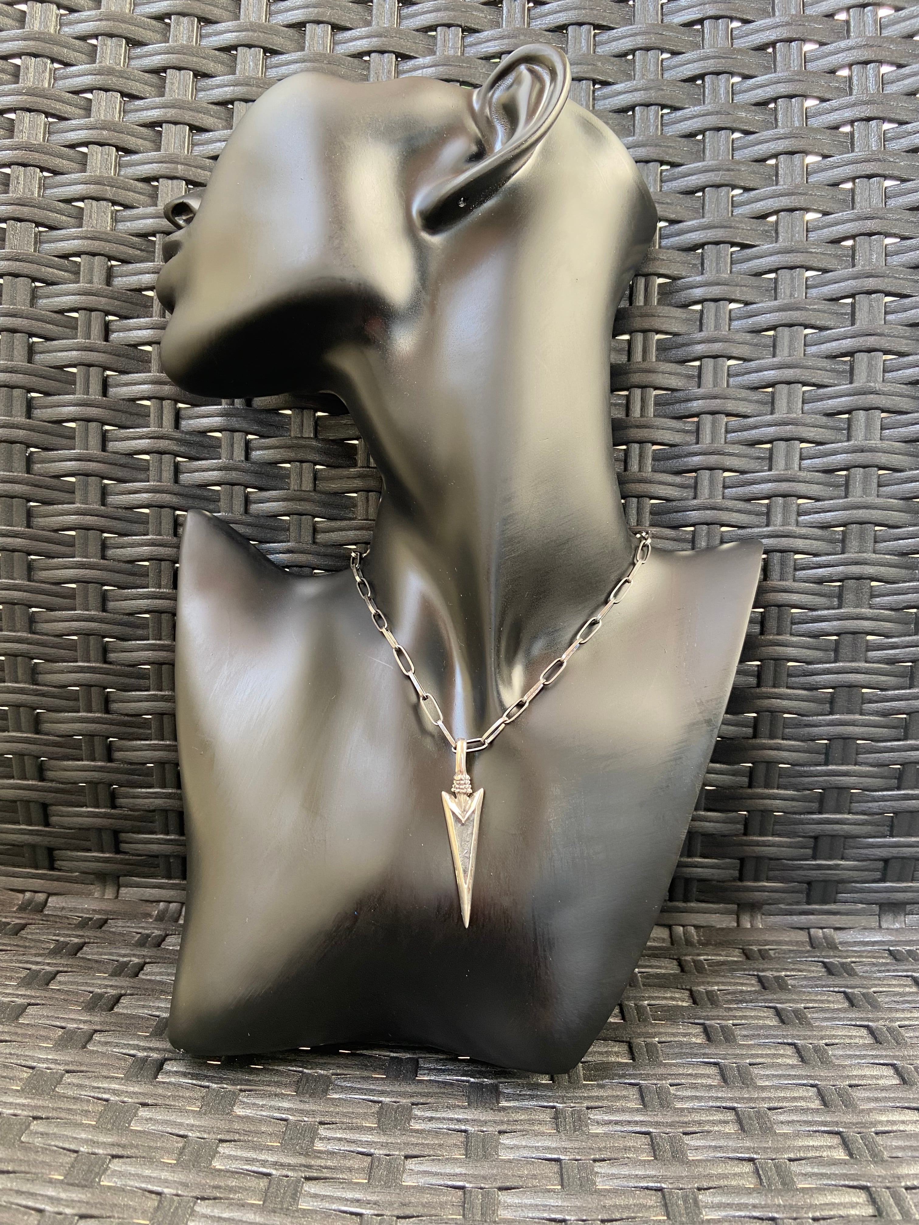 スタイリッシュなデザインのシルバートップ槍ペンダントです。クローム仕上げの美しいチェーンとの相性が魅力で、ユニセックスなスタイルを提案します。シンプルながらも目を引くデザインは、単品でも他のアクセサリーと重ねて着用することで、より一層おしゃれを楽しむことができます。