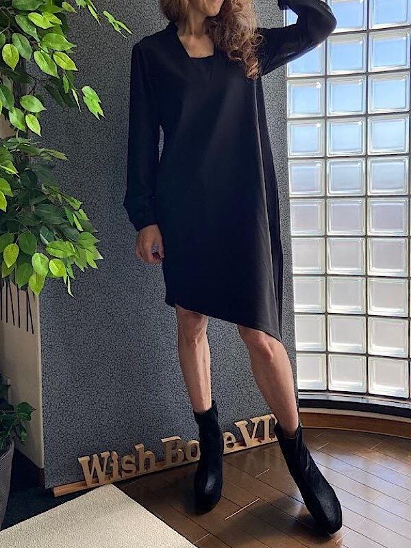 全体的にゆったりしたデザインなのでフリーです。お袖の、やや透け感がとても綺麗ですよ。モデル身長ではアシンメトリーの短い側は少しひざが見える長さになりますが、短いのが気になられるようでしたら黒いストッキングやタイツなど履くと良いかと思います。