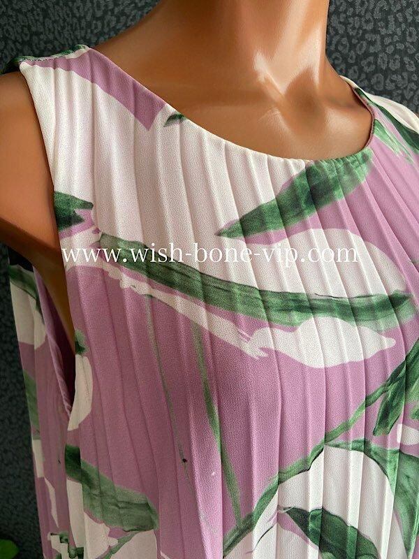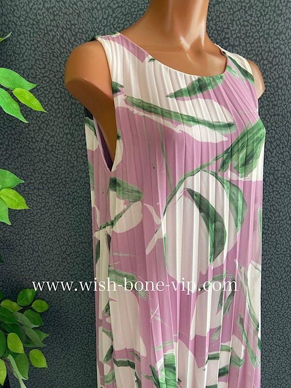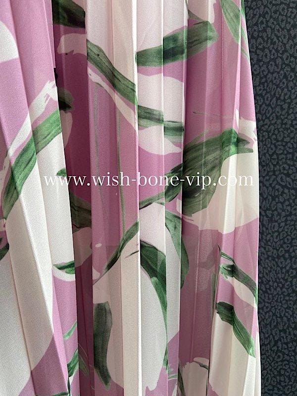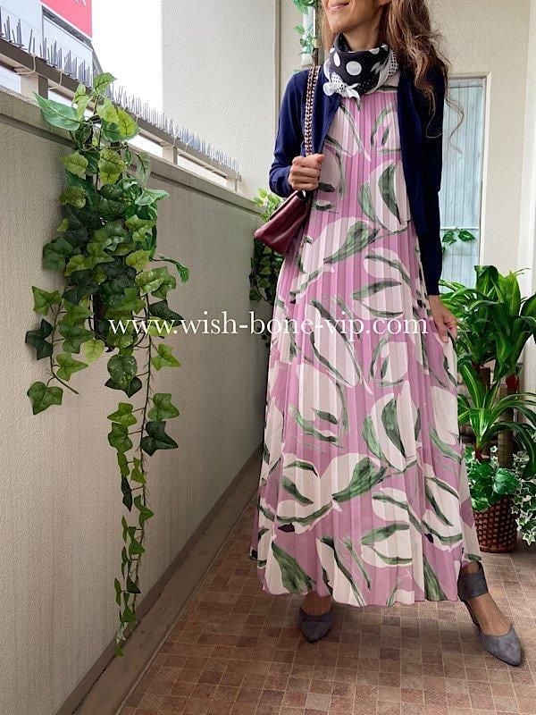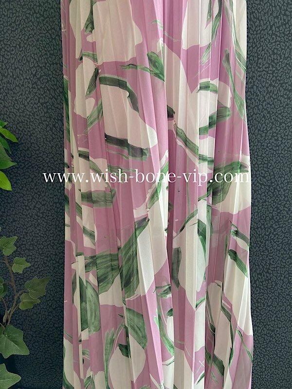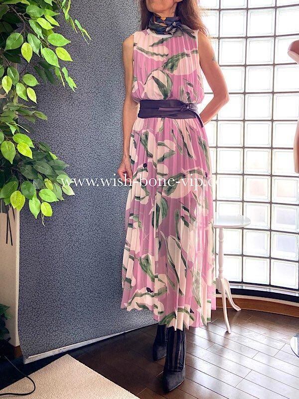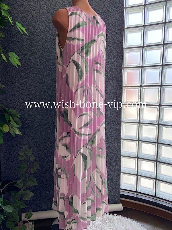 上品で華やかなシフォン素材を使用し、プリーツ加工が施されたロングドレスです。ボートネックとAラインのシルエットが女性らしいエレガンスを演出し、ピンクとパープルの柔らかいカラーが、優雅でロマンティックな雰囲気!!着心地もとっても良いですよ。