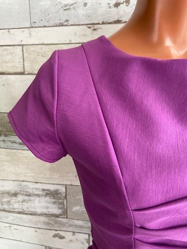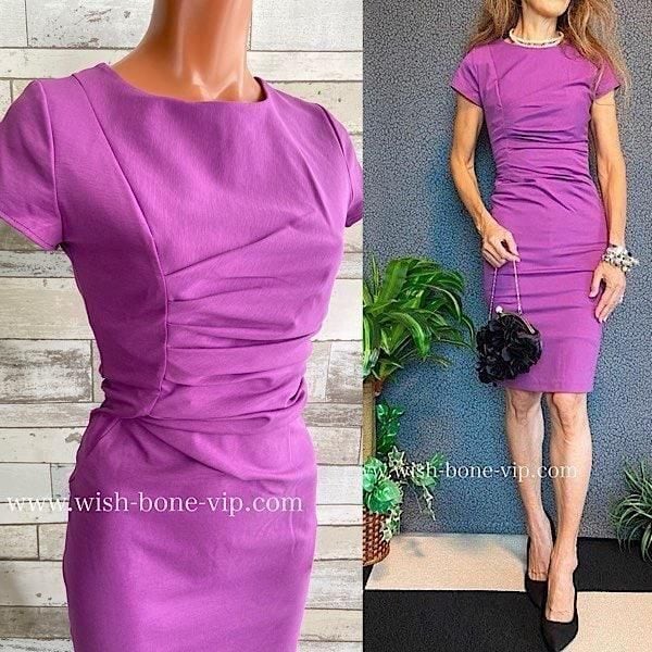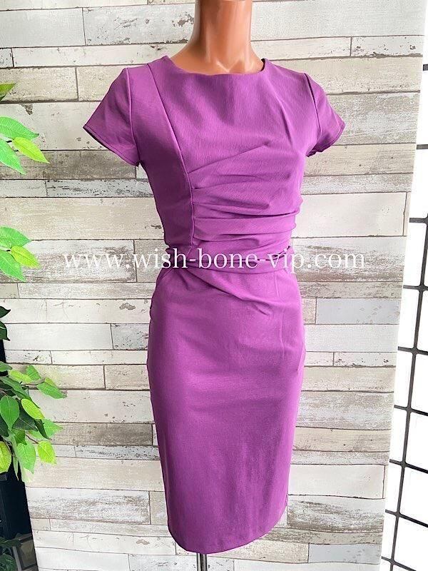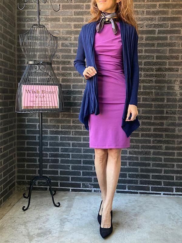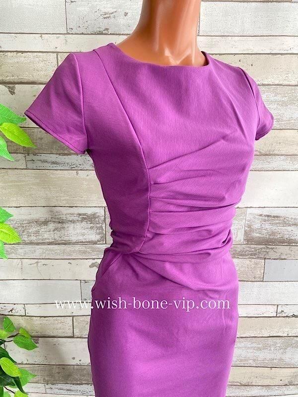 ピンクパープルの色合いがとてもきれいなタイトワンピースです。ストレッチが良くウエストのカットが女らしいシルエットを作ってくれ、シンプルですが飽きなくコーディネートをお楽しみ頂けそうですよ。