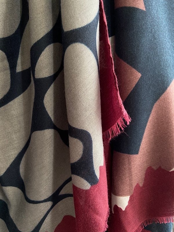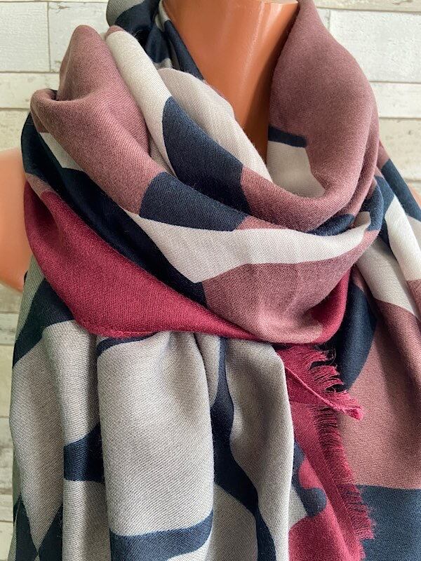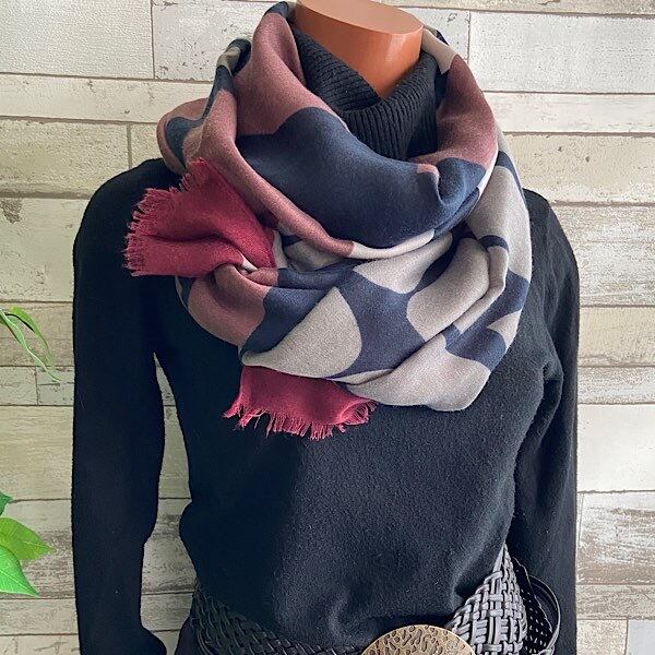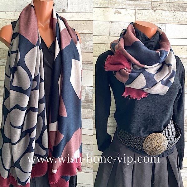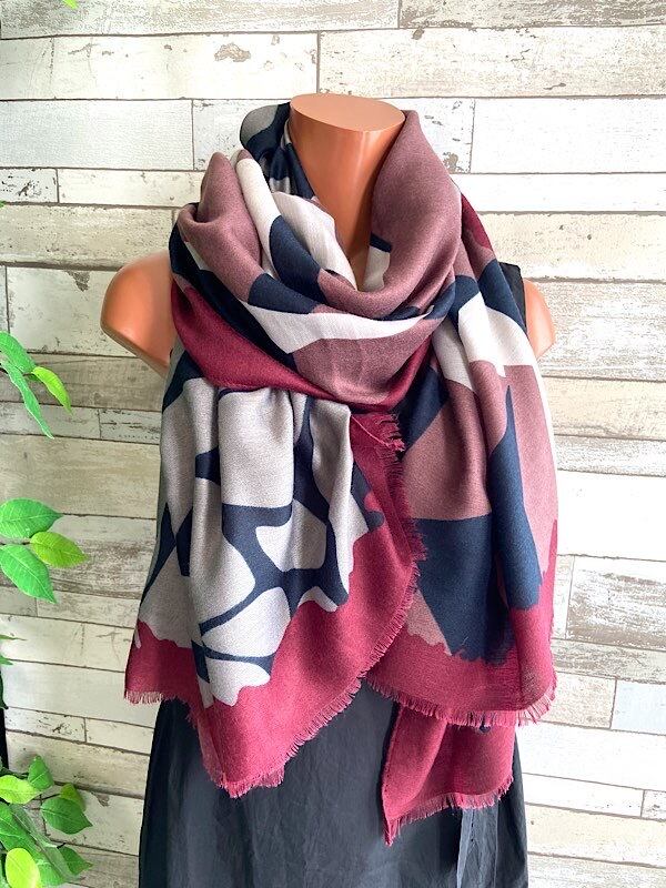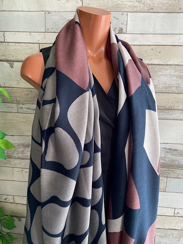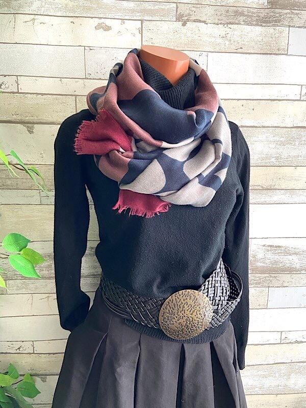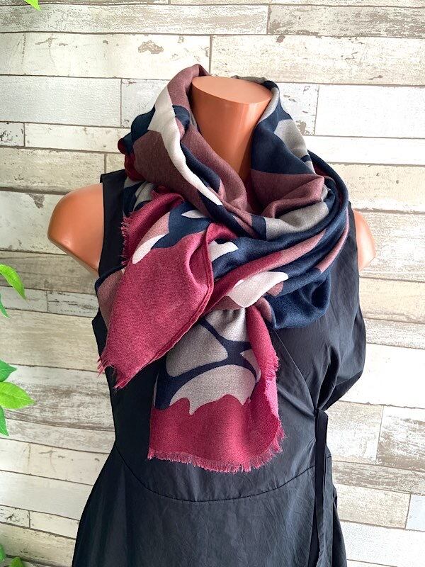 なめらかな素材が肌心地のいいストールです。すごく合わせやすい色合いだとと思います!巻いた時に左右非対処になるようなプリントも面白いですよ。