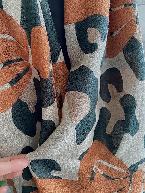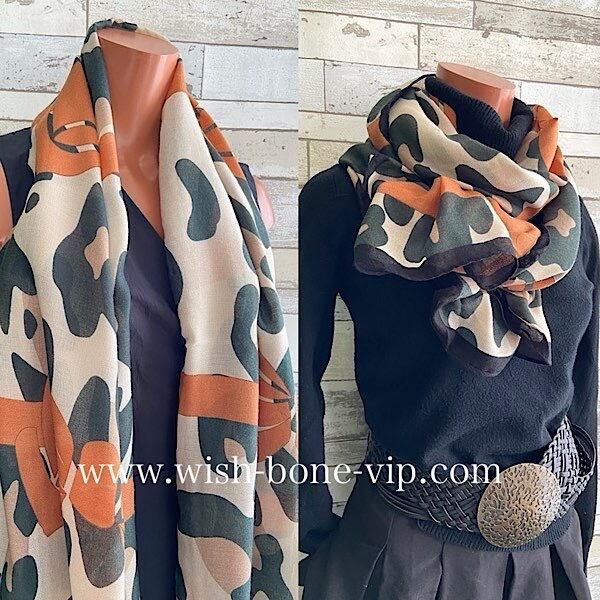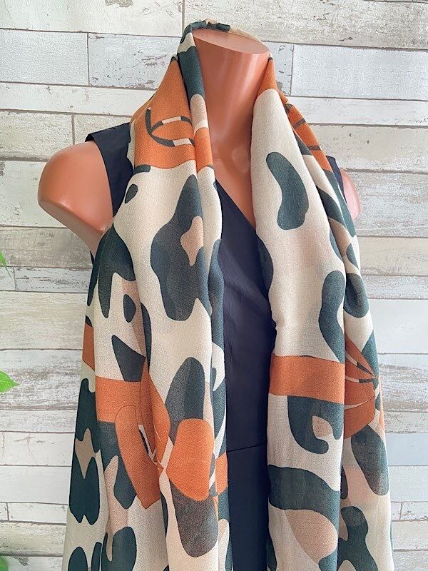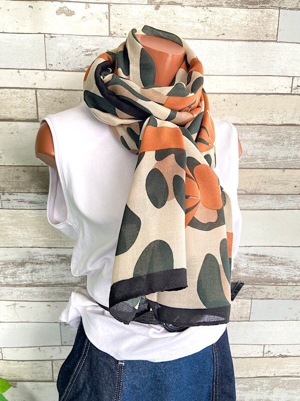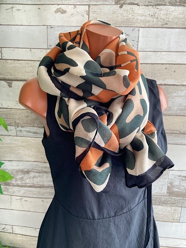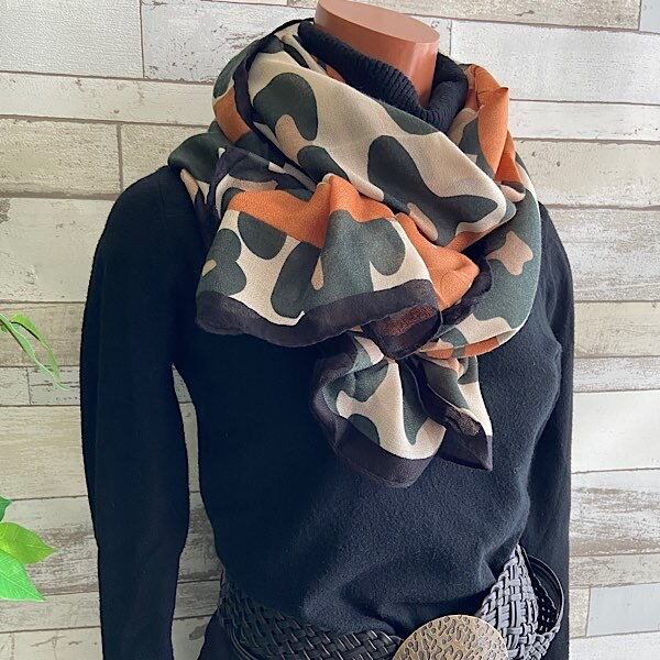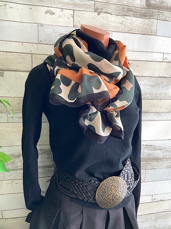 色のトーンがとてもオシャレで、カモフラっぽい柄に大きなリボンですが巻くとリボンは差し色の様になるかな。ストールの中では大判です。ビスコースはテカリなく肌触りが柔らかで心地いいですよ。